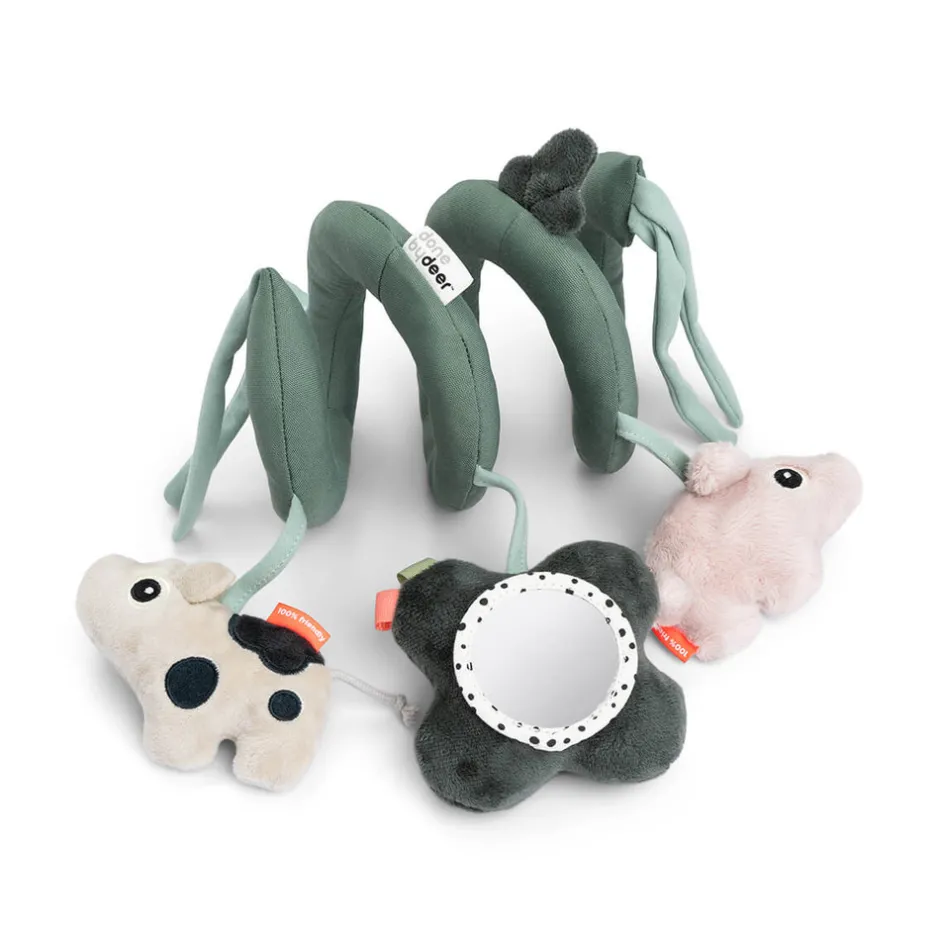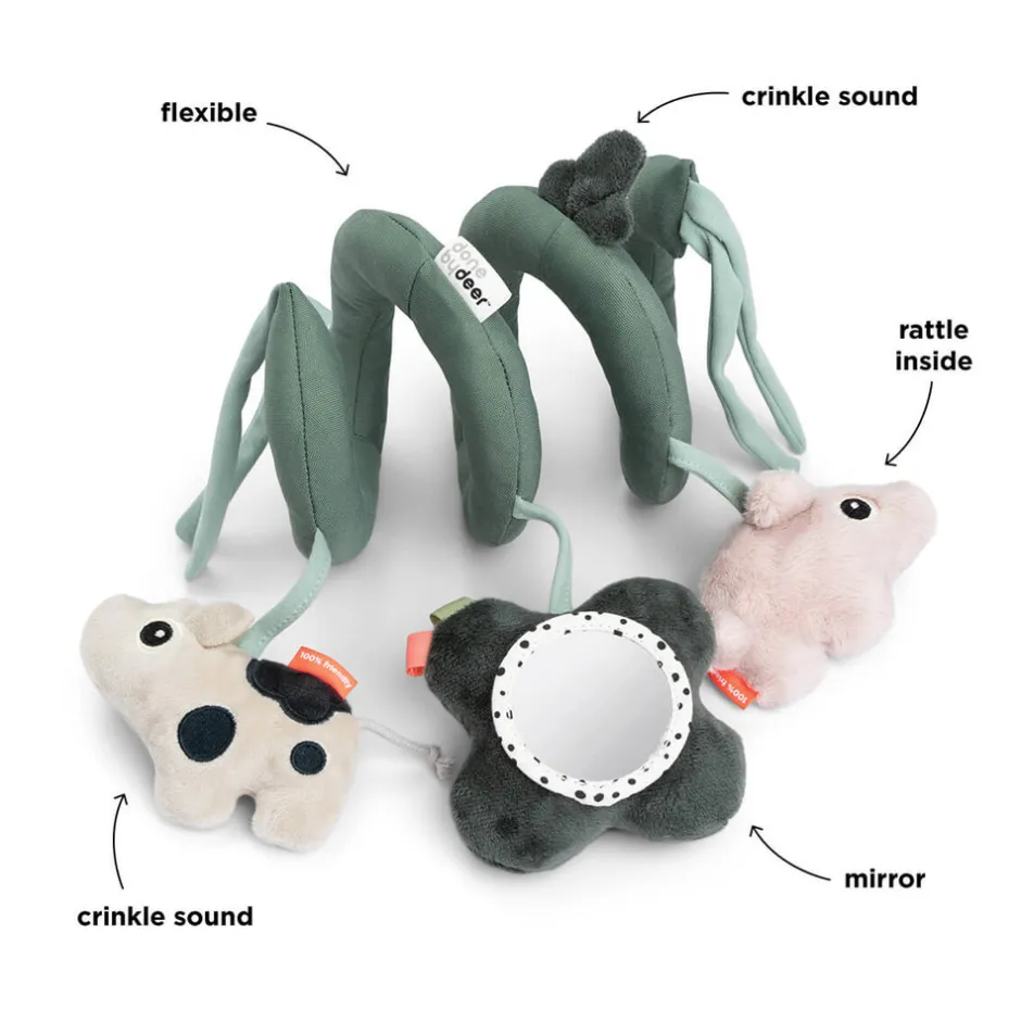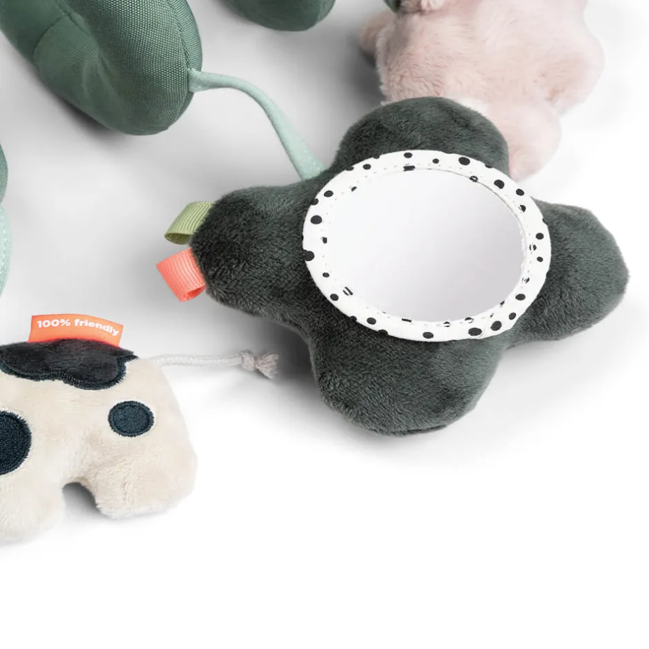 Legetøjet er let at binde på siden af sengen, autostolen eller barnevognen, så det altid er inden for rækkevidde. Den seje grønne farve, kombineret med farverige detaljer og kontraster, giver visuel stimulering, der fanger dit barns opmærksomhed.