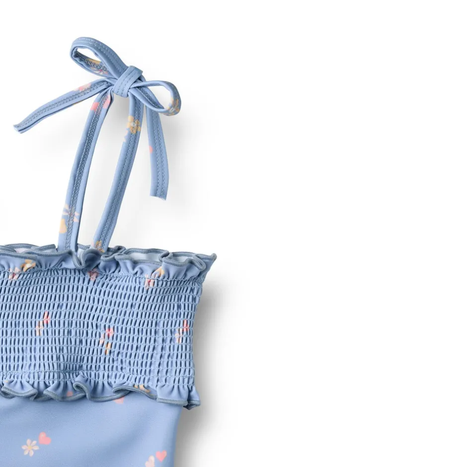 Badedragt har smock-detalje i overdelen, samt tynde stropper med en fin lille sløjfe på toppen. Al badetøj er overvejende produceret i genanvendt polyester, og er Standard 100 fra OEKO-TEX® certificeret.
