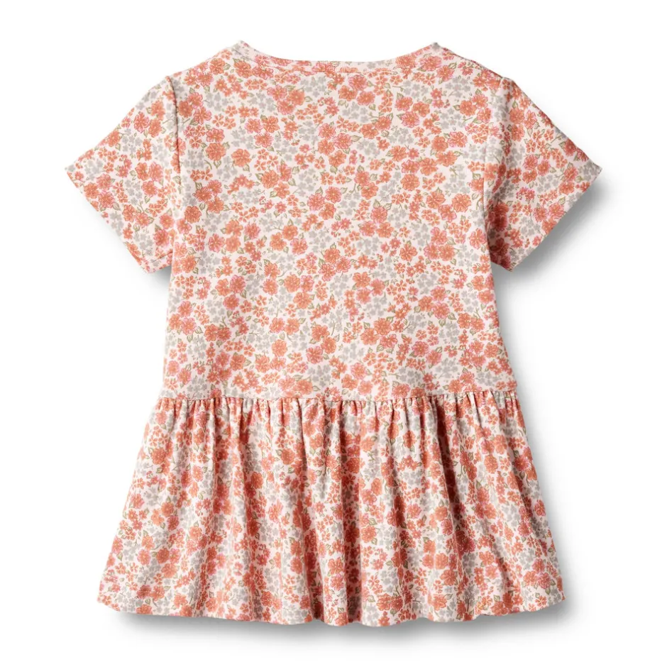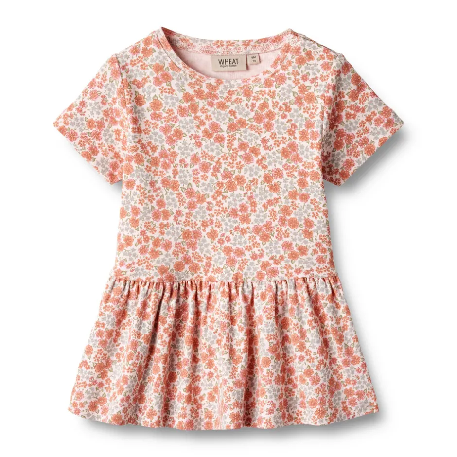 Wheats yndige sommerkjoler har detaljer, prints- og farver, der emmer af sommer. Den har en løs pasform i skørtet, der gør det nemt for dit barn at bevæge sig i den. Kjolen har et flatterende snit med bærestykke under taljen, der giver kjolen et afslappet look med god volumen i skørtet. Kjolen er nem at style efter lejlighed med et par sandaler eller prewalkers afhængigt af vind og vejr. Man kan kombinere kjolen med en cardigan som let jakke udover på de lune sommeraftener.