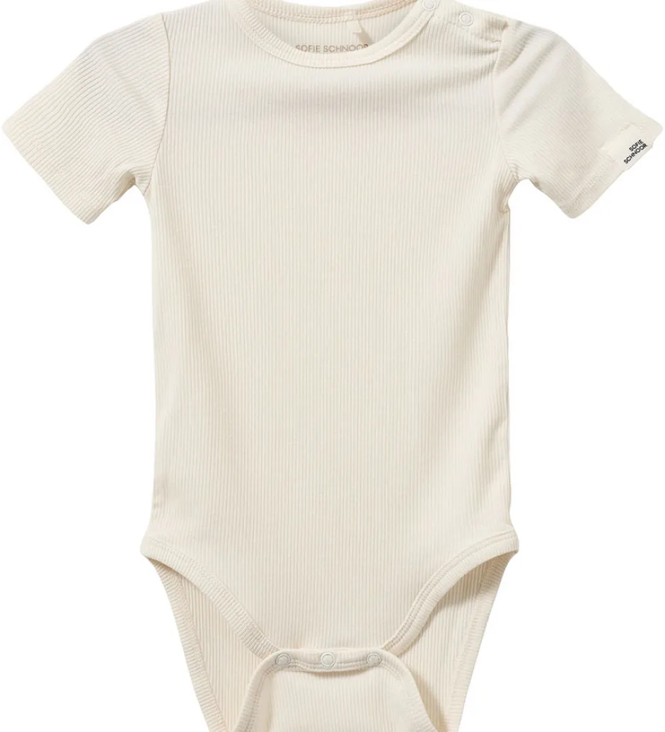 Enkel moderne body i ribbet stof af lækker kvaltit. Trykknapper ved skulderne for nemmere at få af og på, og ligeledes mellem benene for lettere bleskift.