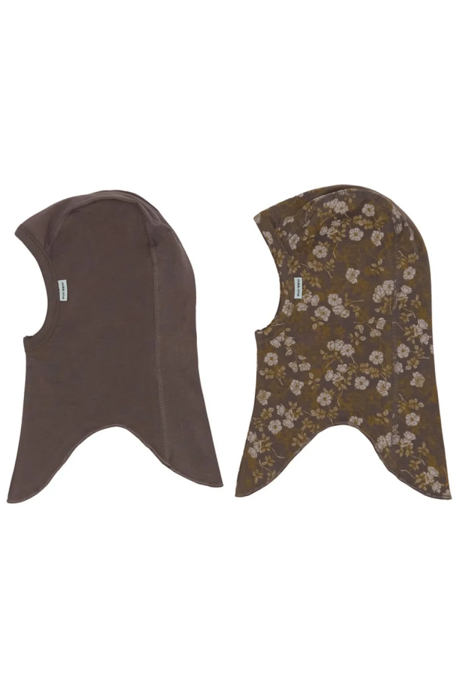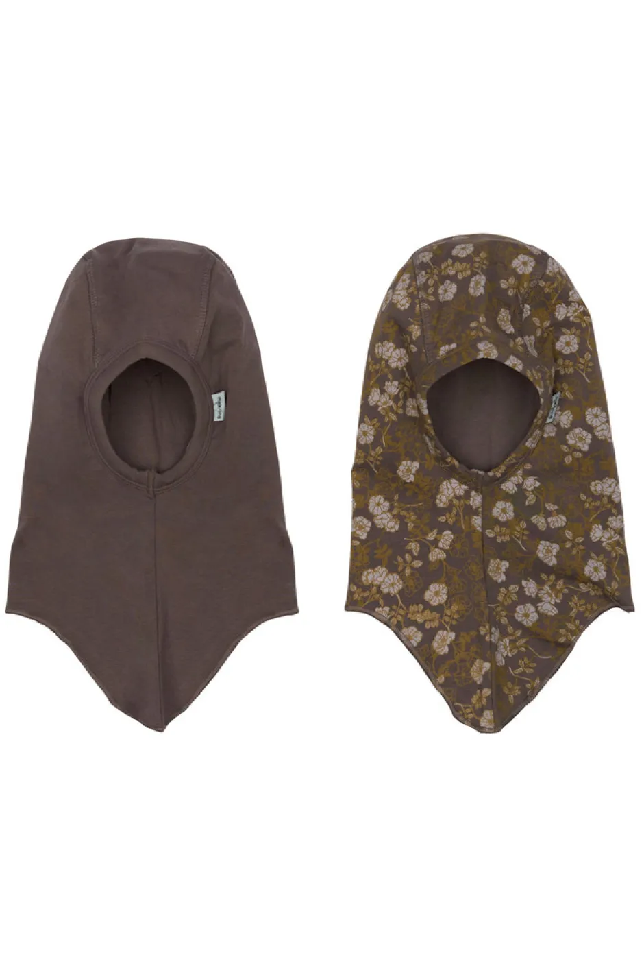 2 pak mikk-line elefanthuer af 100% økologisk bomuld. Huerne er fremstillet i et dobbelt lag stof udelukkende af naturlige fibre, og huerne er bløde, lette og åndbare. Pakken består af en enkelt ensfarvet elefanthue og en elefanthue i et fint printmønster, der fås i forskellige varianter. Elefanthuen dækker det meste af barnets hoved, hals og ansigt, så den beskytter barnet mod kulde og vind, når det leger og udforsker naturen under den åbne himmel.