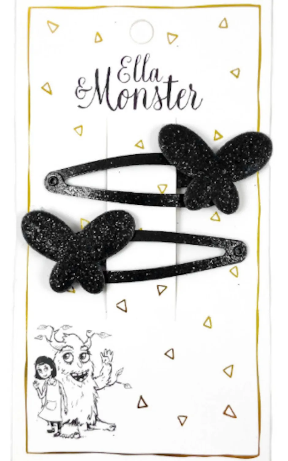 Elegant flugt i sort glimmer! Disse sorte sommerfugle-spænder er både stilfulde og eventyrlige – perfekte til børn, der elsker et mere cool og glitrende look. Et enkelt strejf af magi til både hverdag og fest. Let at sætte i – og svære at tage øjnene fra.