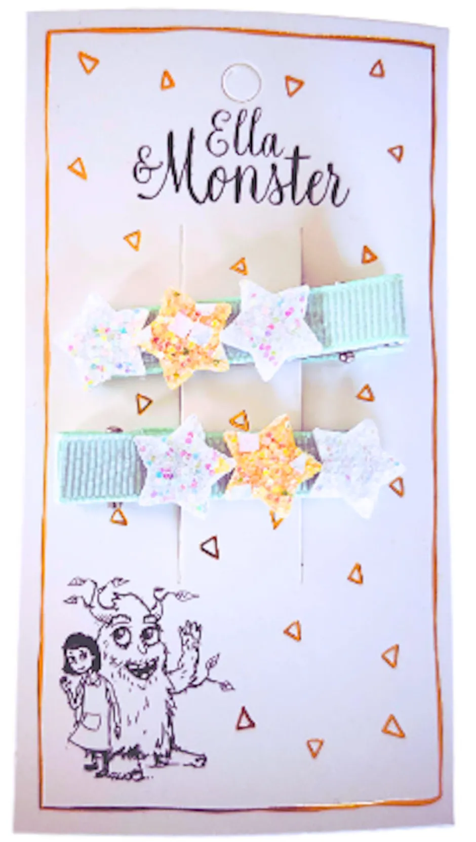 Stjerneskud i pastelfart! Disse mint grønne spænder med glitrende stjerner i guld og lilla drysser stjernestøv over håret – perfekt til små drømmere med sans for farver og fantasi. Let at sætte i – og skabt til at lyse op i hverdagen.