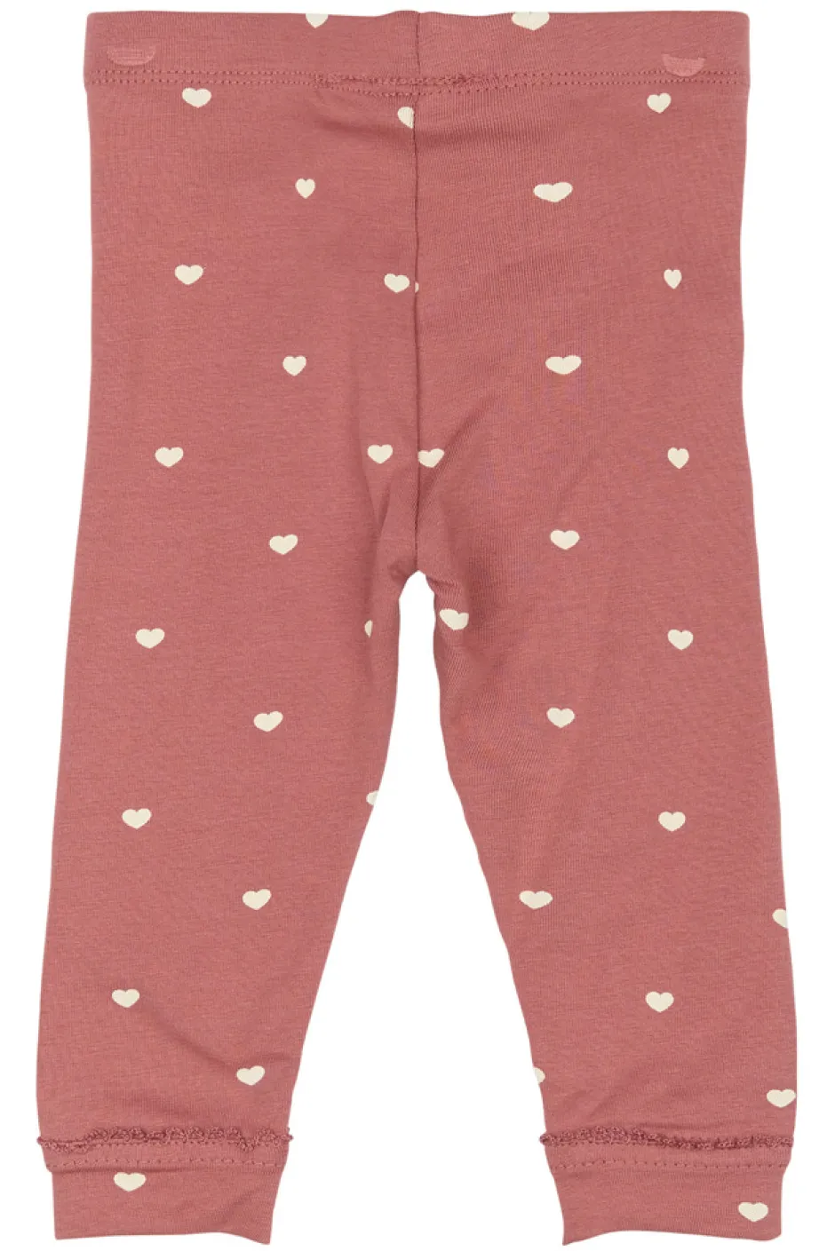 Bedårende leggings i en smuk farve med små hjerteprint. Fremstillet af blødt og strækbart bomuldsstof, der sikrer høj komfort og bevægelsesfrihed for din baby. Ben åbningerne har delikate bølgede kanter, der tilføjer en sød og feminin detalje til designet. Perfekte både til hverdagsbrug og hyggelige stunder.
