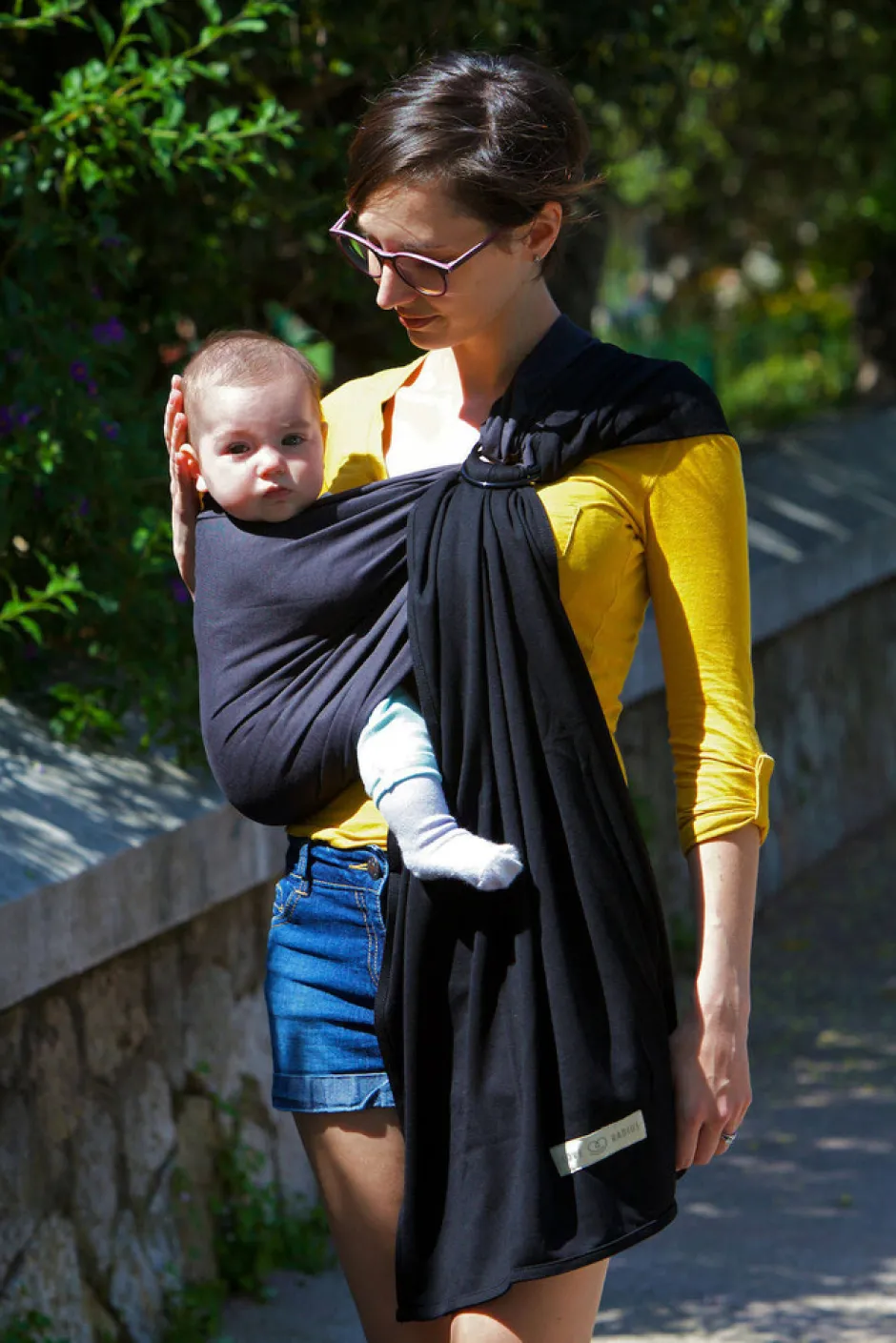 Ringslyngen fra franske je porte mon bébé. Super let at bruge, her skal der ikke bindes en knude. Du tager den bare over skrå, indstiller den i ringen og sætter dit barn i den. Ringslyngen er bedst egnet til kortere ture, ønsker du at bære dit barn over længere tid, så bør du overveje en vikle i stedet.
