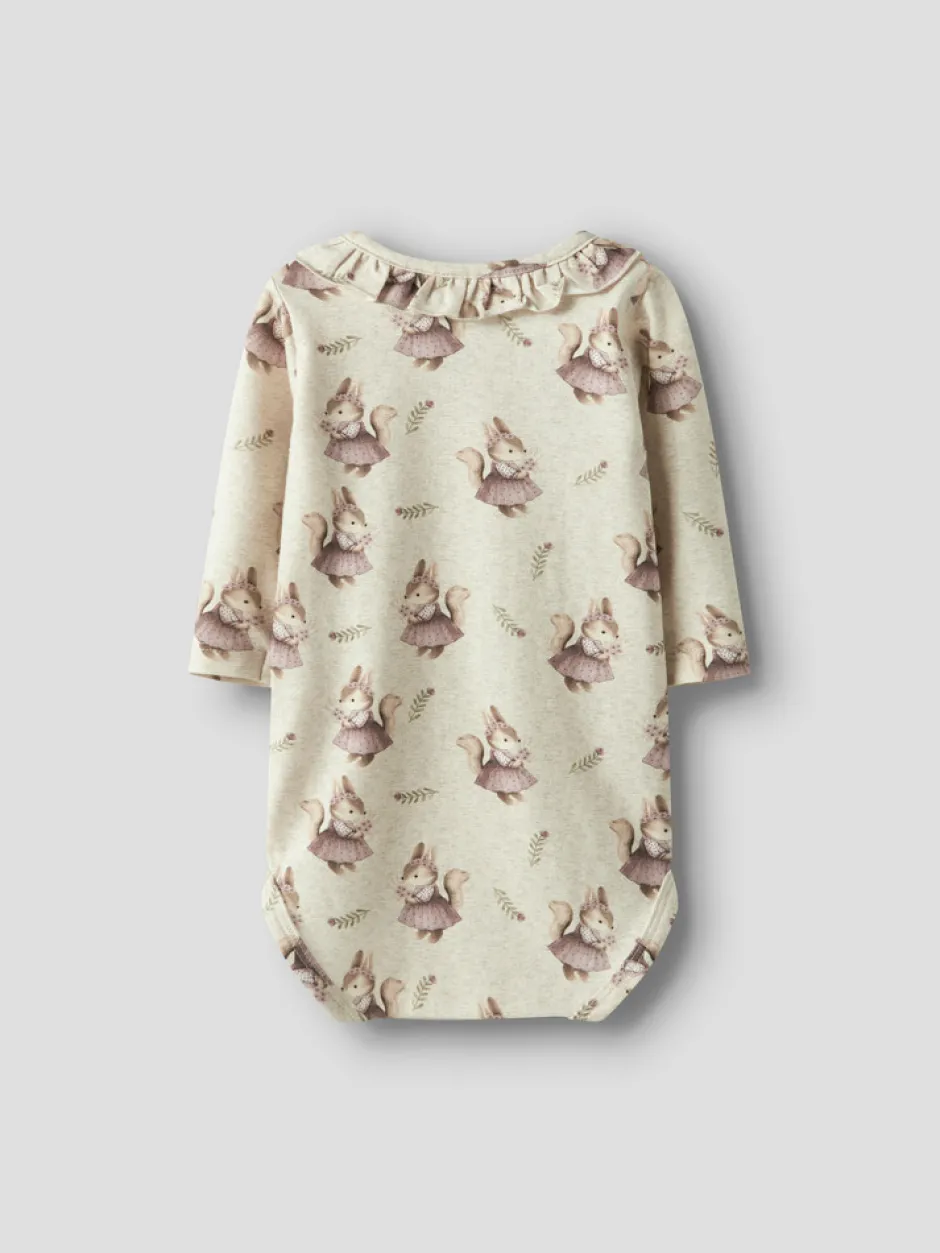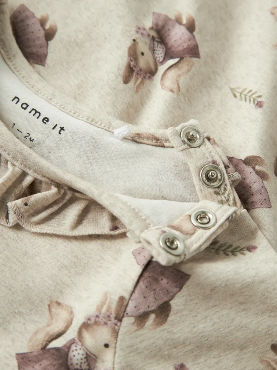 Shelly Langærmet Body fra NAME IT i farven Peyote melange er et skønt valg til de mindste. Den bløde bomuldskvalitet sikrer komfort hele dagen, og det søde print med små egern i kjole giver et charmerende udtryk. Bodyen har en fin flæsekant ved halsen, som tilføjer et feminint touch, og de lange ærmer sørger for, at barnet holdes varmt. Praktiske trykknapper i bunden gør det nemt at skifte ble, og den elastiske halsudskæring gør påklædningen let. Perfekt til både hverdag og festlige lejligheder, hvor komfort og stil går hånd i hånd.