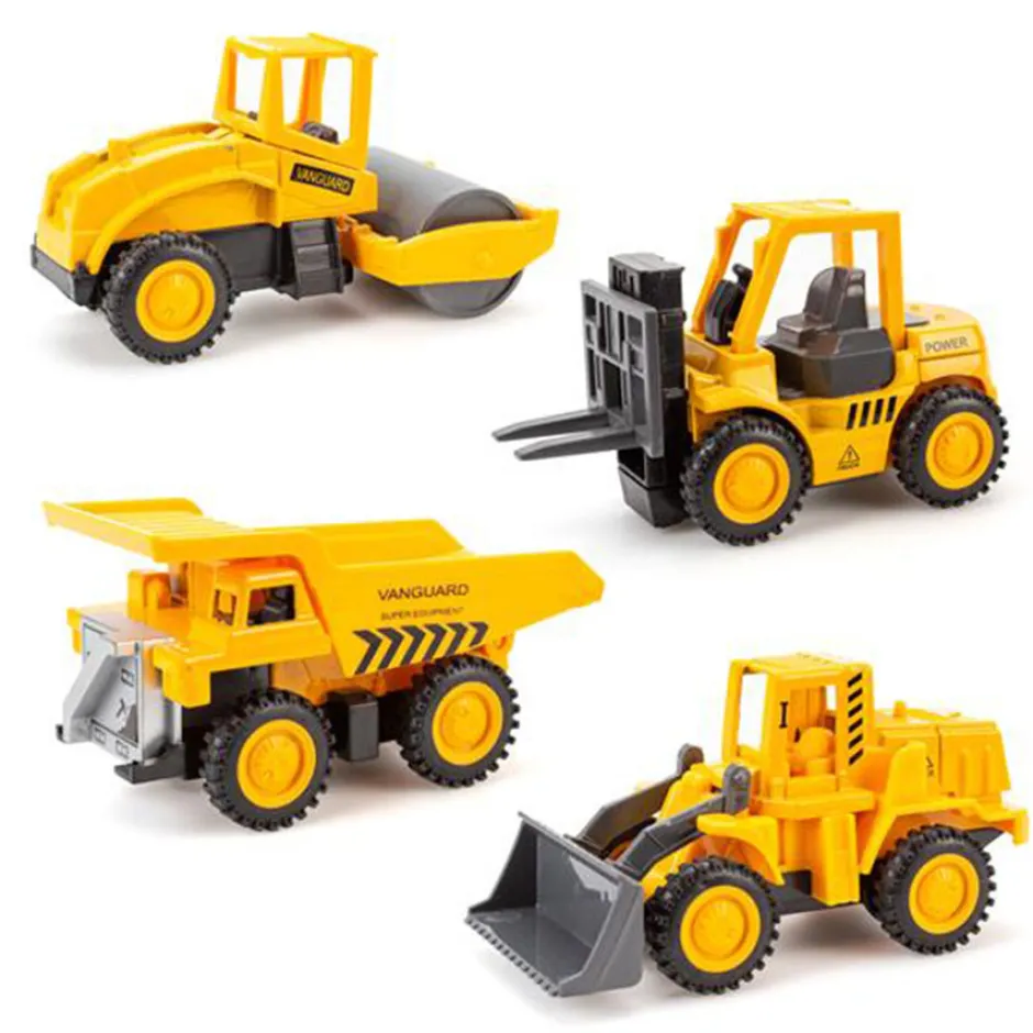 Små gule arbejdsbiler med pull back. Findes i 4 modeller. 8,5 cm lang.