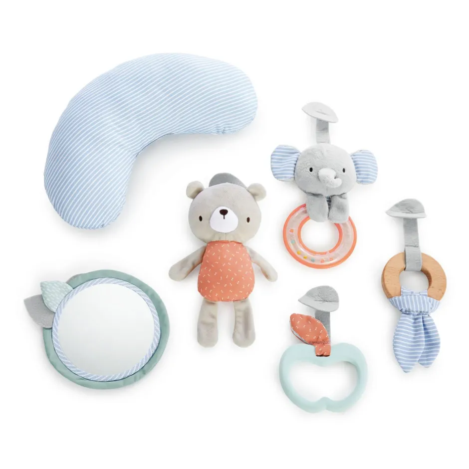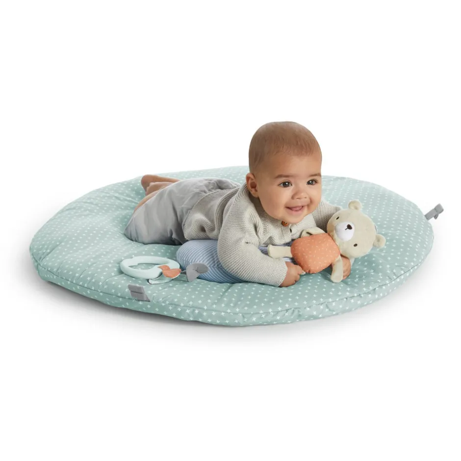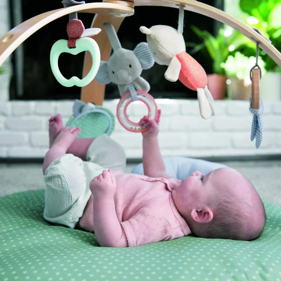 Giv dit barn det mest hyggelige sted at strække ud og lege. Dette aktivitetsstativ er udstyret med en dynemadras. Den kan vendes og er grå på den ene side og grøn på den anden. Dynen er så blød og rar for den lille at ligge på. Til den naturfarvede trælegetøjsbjælke følger der diverse aktivitetslegetøj med samt en pude hvor den lille kan øve finmotorikken. Aktivitetsstativet kan foldes sammen og kan nemt transporteres.
