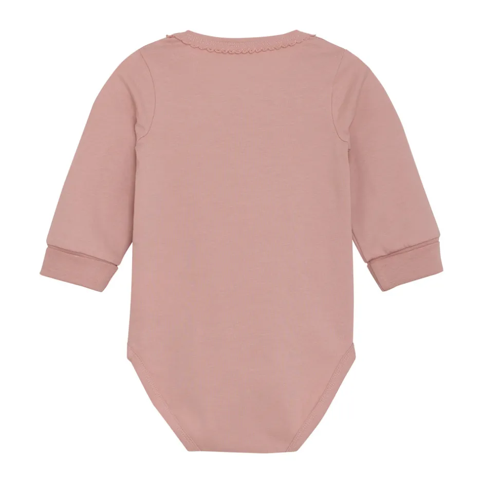 Langærmet body fra Minymo med et sødt print. Bodyen er fremstillet i en blød bomuldsblanding, der føles behagelig og skånsom mod barnets hud. Den er designet med trykknapper mellem benene, placeret i to forskellige positioner, så bodyen kan justeres og vokse med barnet. Et lille Minymo-logo ved benet fuldender det fine udtryk.