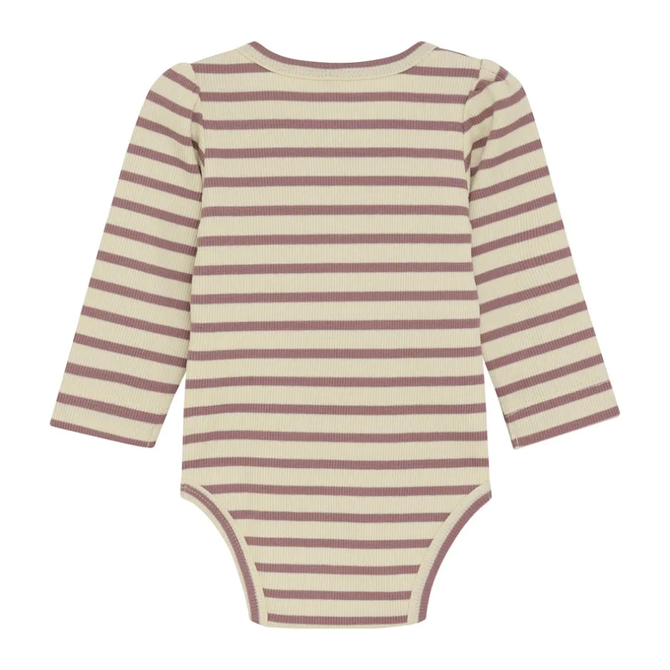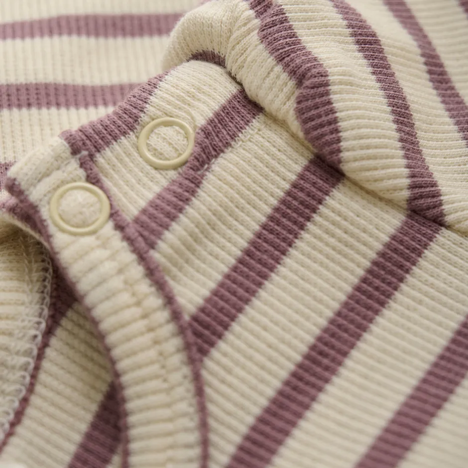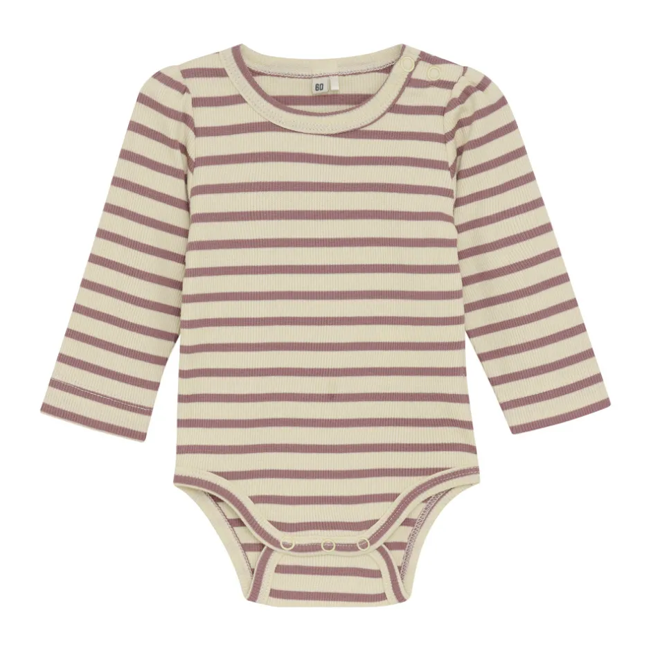 Blød og behagelig body i ribbet bomuld med klassiske striber. Den langærmede design giver ekstra varme, perfekt til køligere dage. Trykknapper i skridtet og på skulderen gør det nemt at tage bodyen af og på. En hverdagsfavorit til små opdagelsesrejsende!