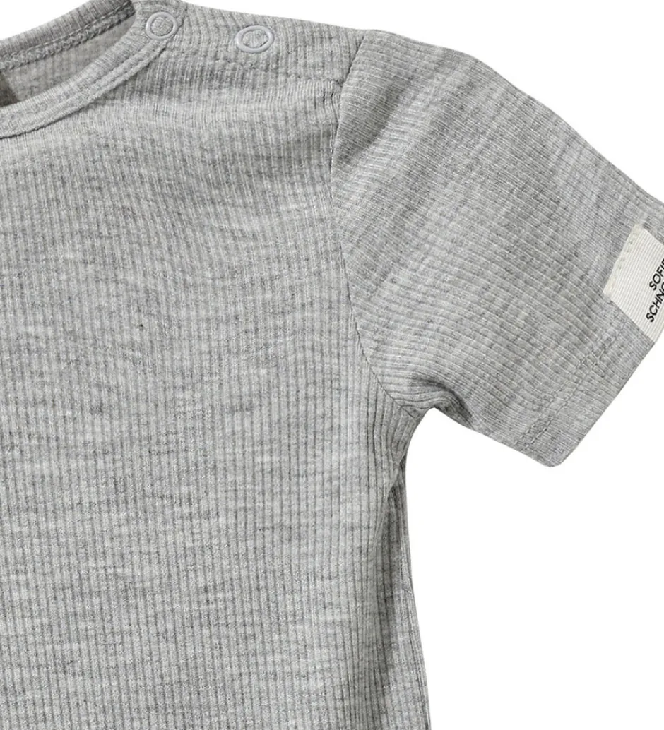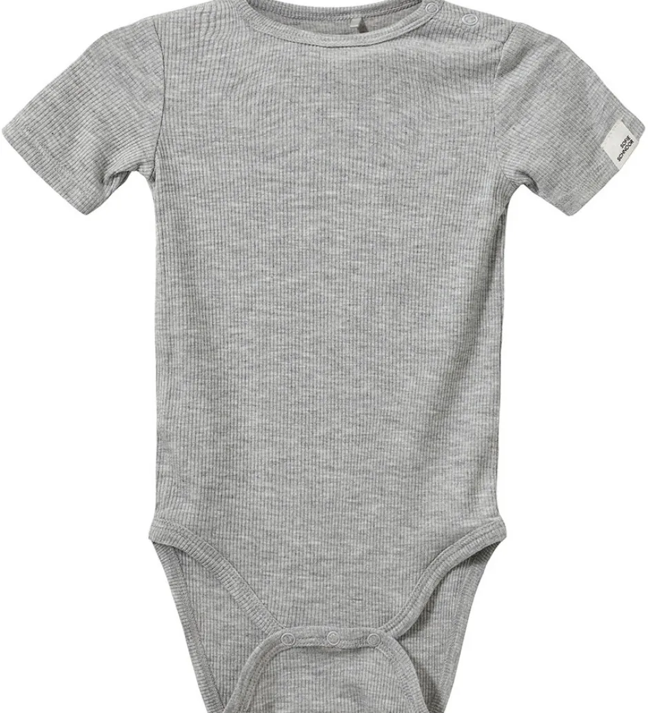 Enkel moderne body i ribbet stof af lækker kvaltit. Trykknapper ved skulderne for nemmere at få af og på, og ligeledes mellem benene for lettere bleskift.