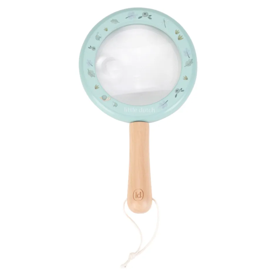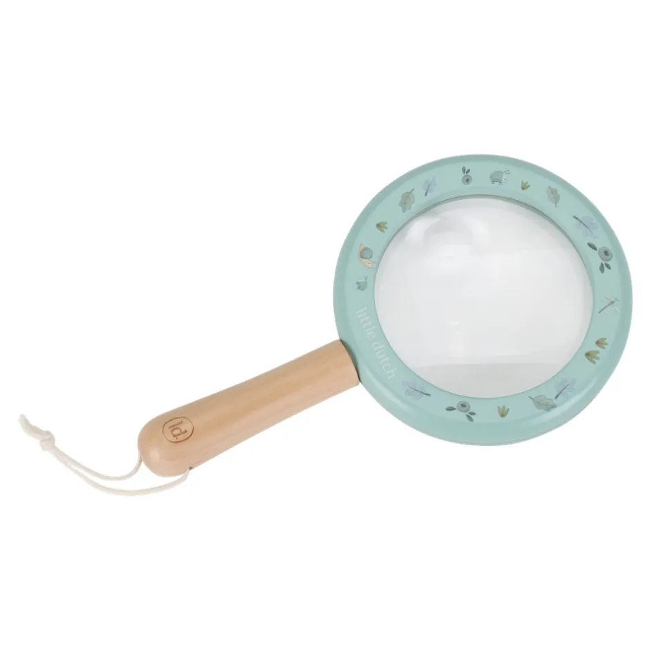 Udforsk naturen med dette forstørrelsesglas! Den robuste træramme og det behagelige håndtag sikrer et godt greb, mens de smukke illustrationer tilføjer et legende touch. Forstørrelsesglasset har en ekstra lille linse, så du kan se endnu flere detaljer. Med en praktisk snor til ophængning er det altid inden for rækkevidde for nysgerrige opdagelsesrejsende. Perfekt til små eventyrere, der vil udforske verden omkring sig og finde små væsner.