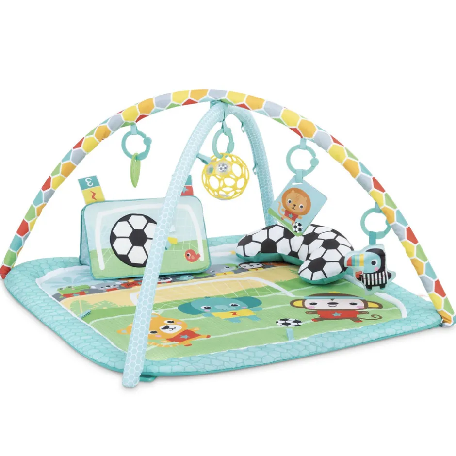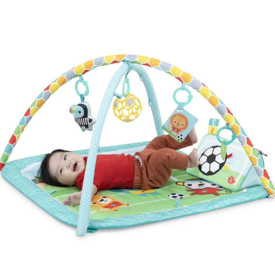 Bright Starts Grip & Kick Oball aktivitetscenter med fodboldtema kan bruges på 4 måder, efterhånden som baby vokser: Baby kan ligge på maven, baby kan ligge og lege, baby kan sidde og lege, eller legemåtten kan tages med på farten; inkluderer blød sparkepude og understøttende pude til, når baby ligger på maven
