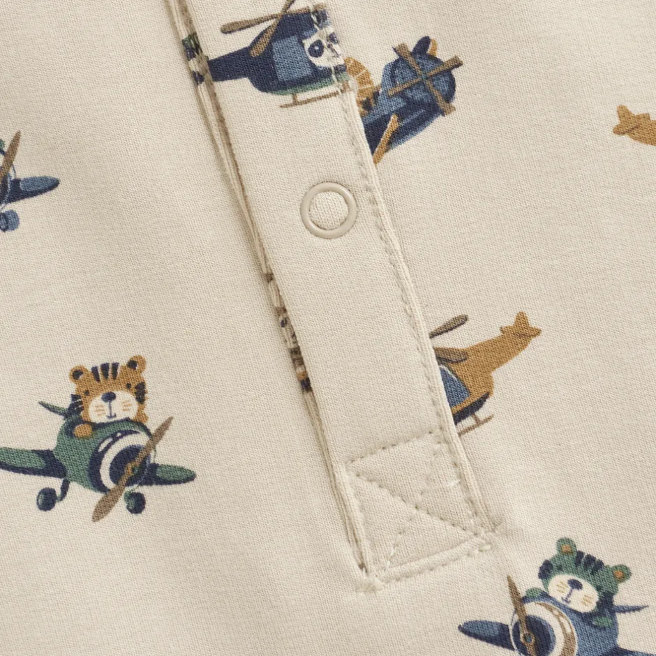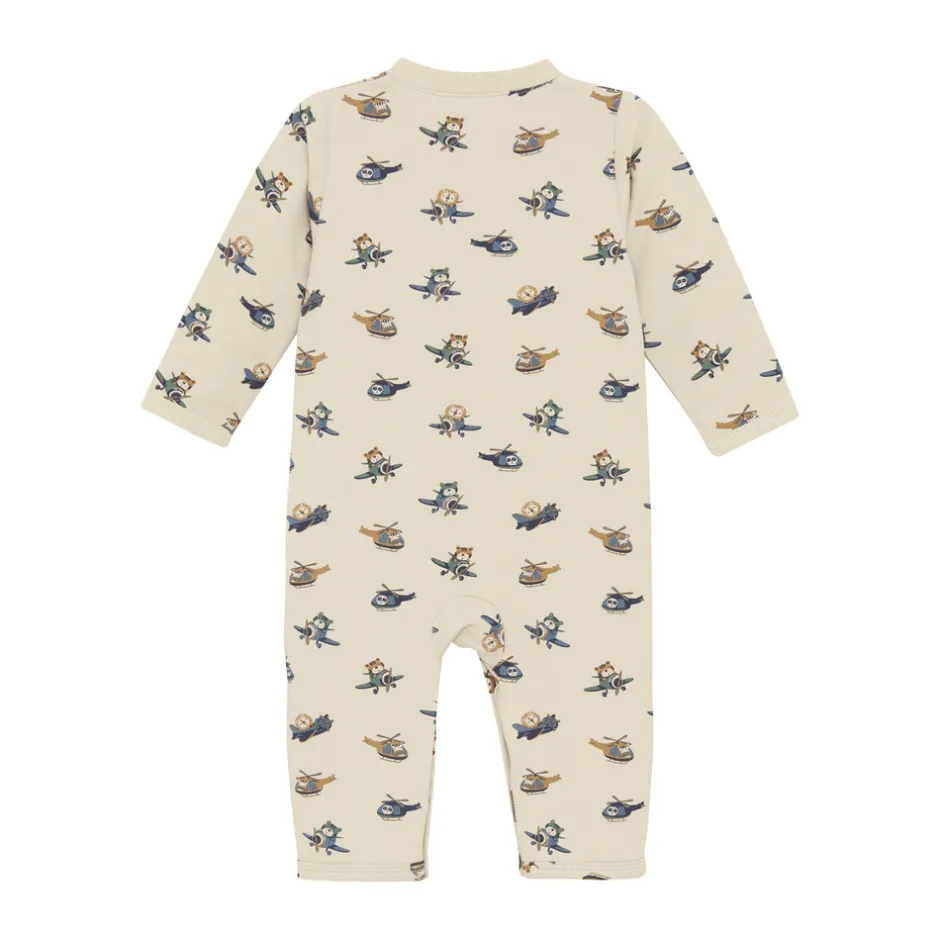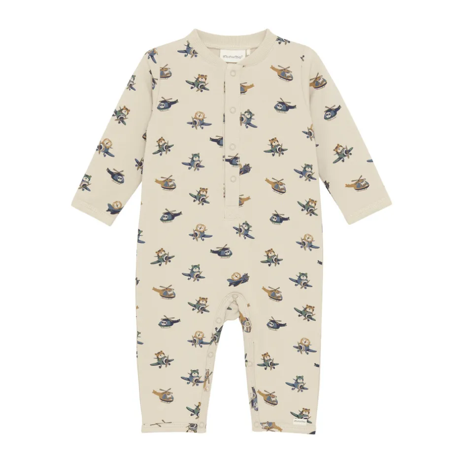 Heldragt fra Minymo med all-over print. Heldragten er lavet i en blød og behagelig kvalitet, der giver maksimal komfort for de mindste. Den er designet med praktiske trykknapper foran og mellem benene, som gør det nemt at klæde barnet på og skifte ble.