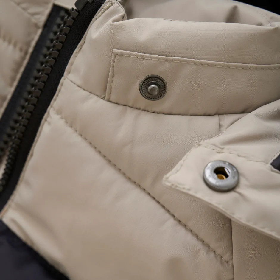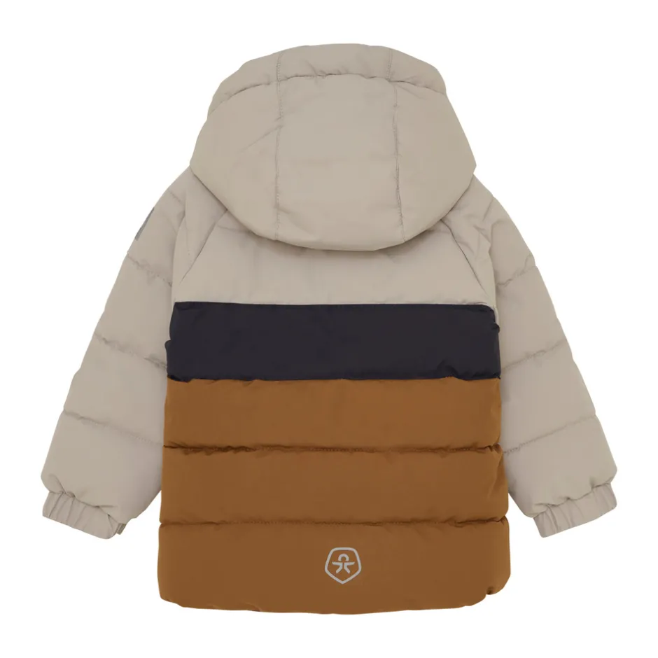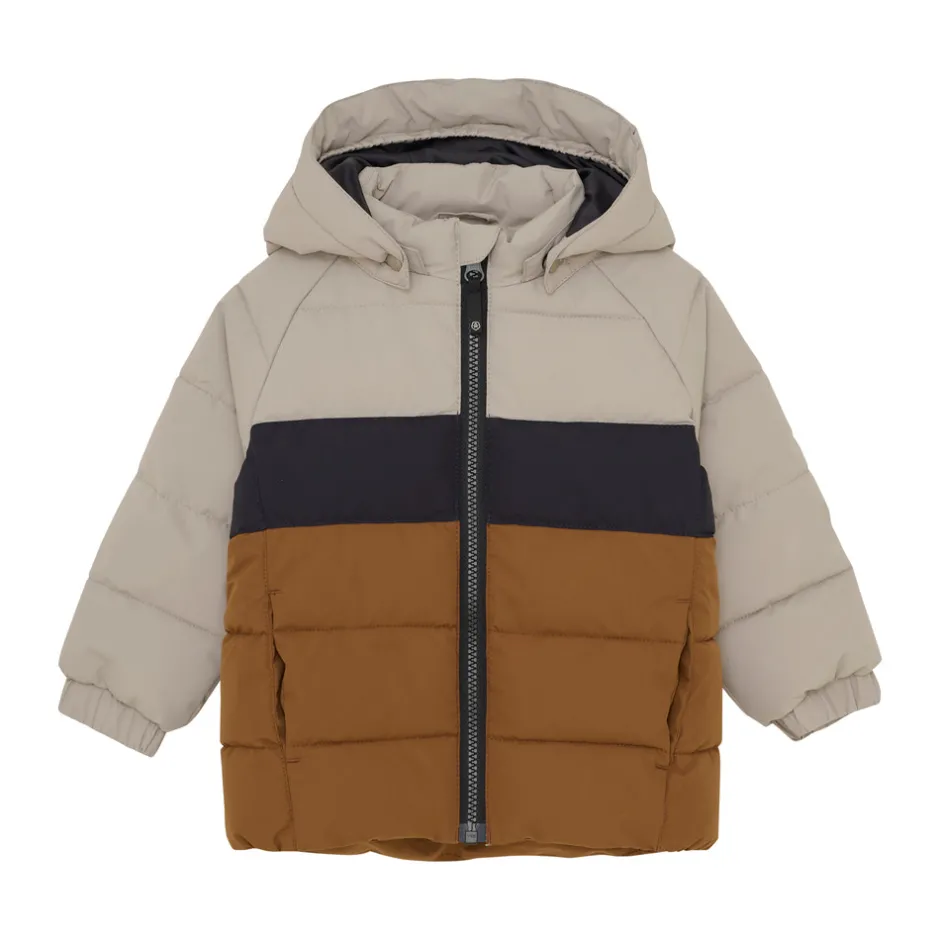 Varm, quiltet vinterjakke med moderne color block-design – skabt til at holde dit barn komfortabelt og beskyttet i vintervejret. Jakken er lavet af et slidstærkt og delvist genanvendt materiale, der er både åndbart, vind- og vandtæt. Med en testet slidstyrke på 20.000 gnidninger, et vandsøjletryk på 8.000 mm og en åndbarhed på 3.000 g/m²/24h, er den ideel til både leg og hverdag i koldt og vådt vejr.