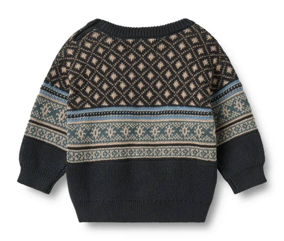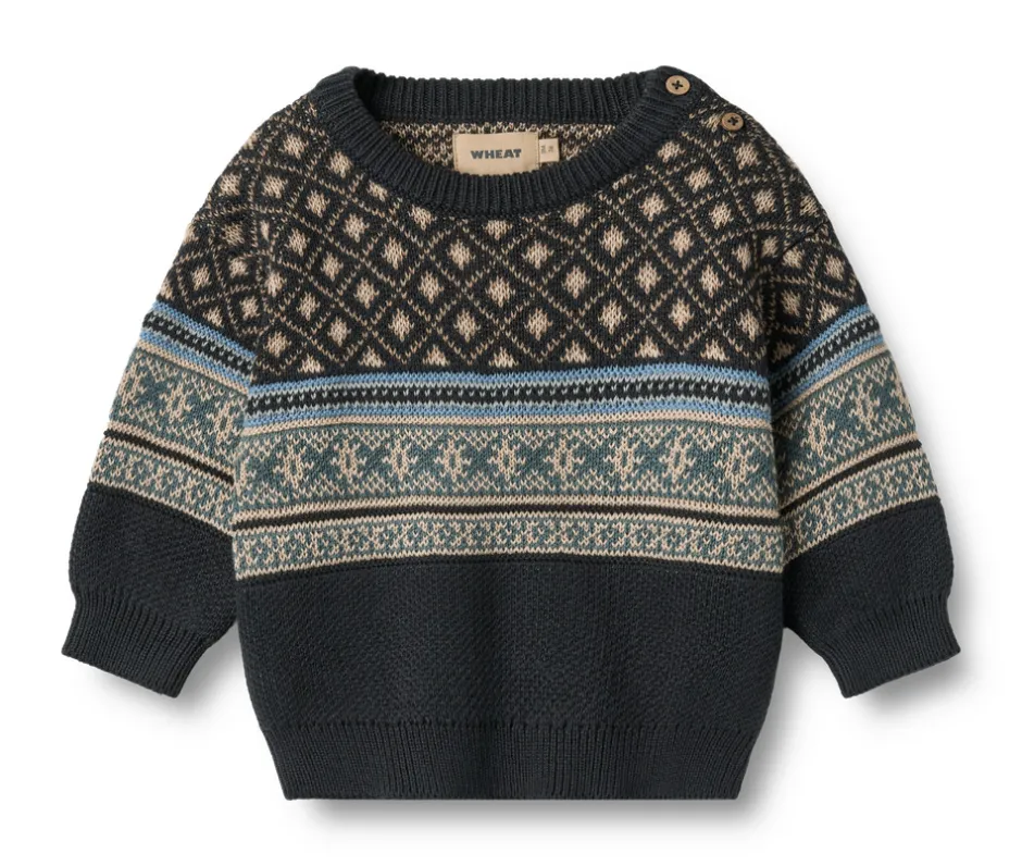 Langærmet strik pullover i blød økologisk bomuld til din baby. Wheats strik er en sand klassiker i de kolde efterårs- og vintermåneder, da den er blød og behagelig for dit barn at have på. Vores strik har et klassisk look med en afslappet pasform, der gør det nemt at style med et par bukser eller over en kjole alt efter vejr og lejlighed.