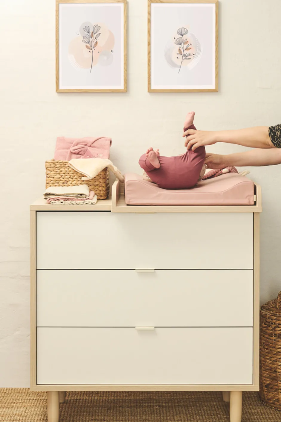 Enkel og solid puslekommode med 3 gode skuffer, som giver perfekt mulighed for opbevaring af det der er brug for lige ved hånden når det er pusletid. Rammen er i flot trælook som give hele kommeoden et flot design. Når pusletiden er forbi er puslepladen lige til at fjerne, og man har en kommode til børneværelset.