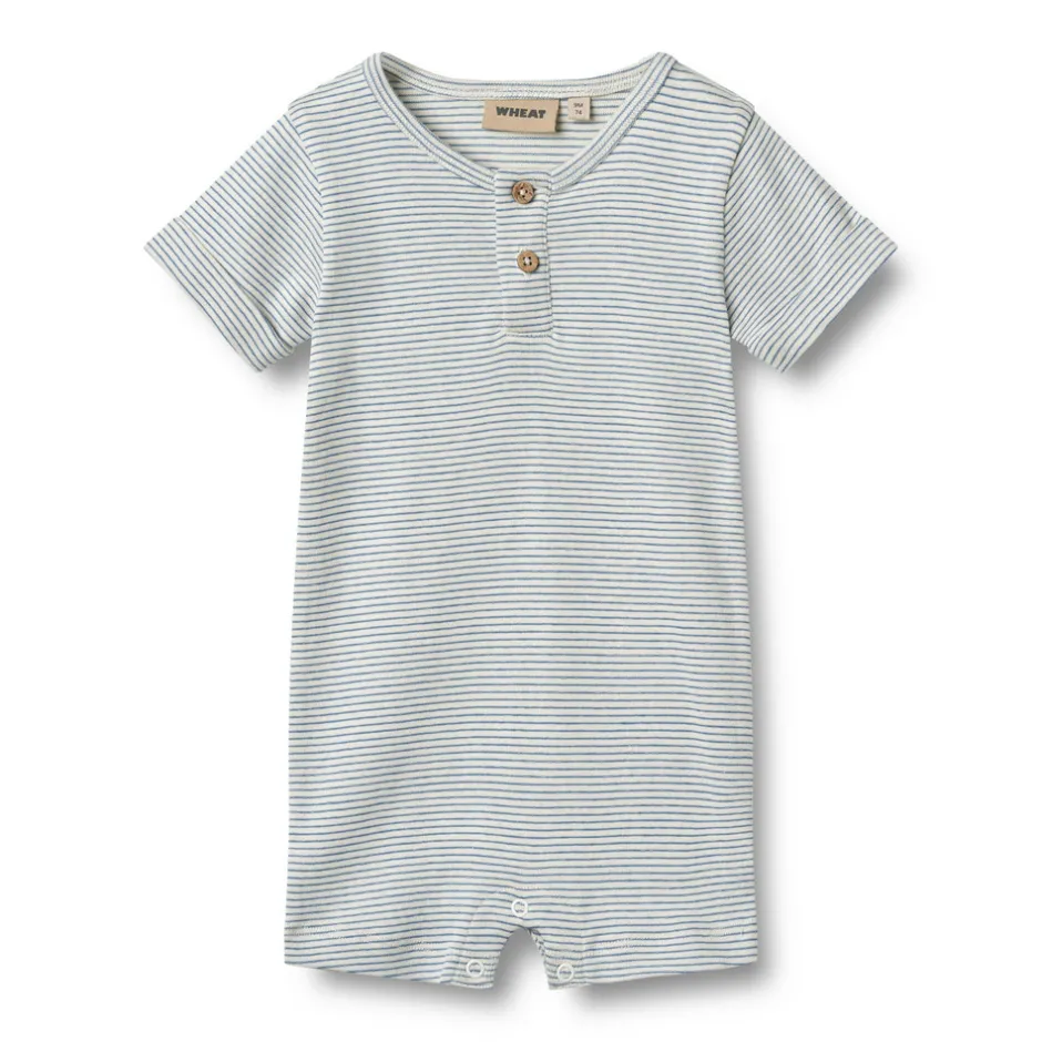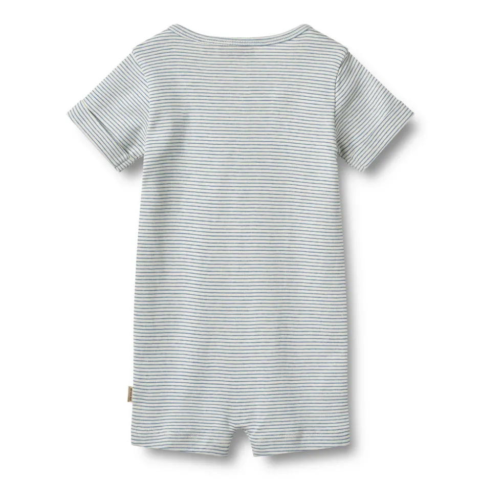 Stripet sparkedragt med korte ærmer og ben i blød økologisk bomuld til babyer.