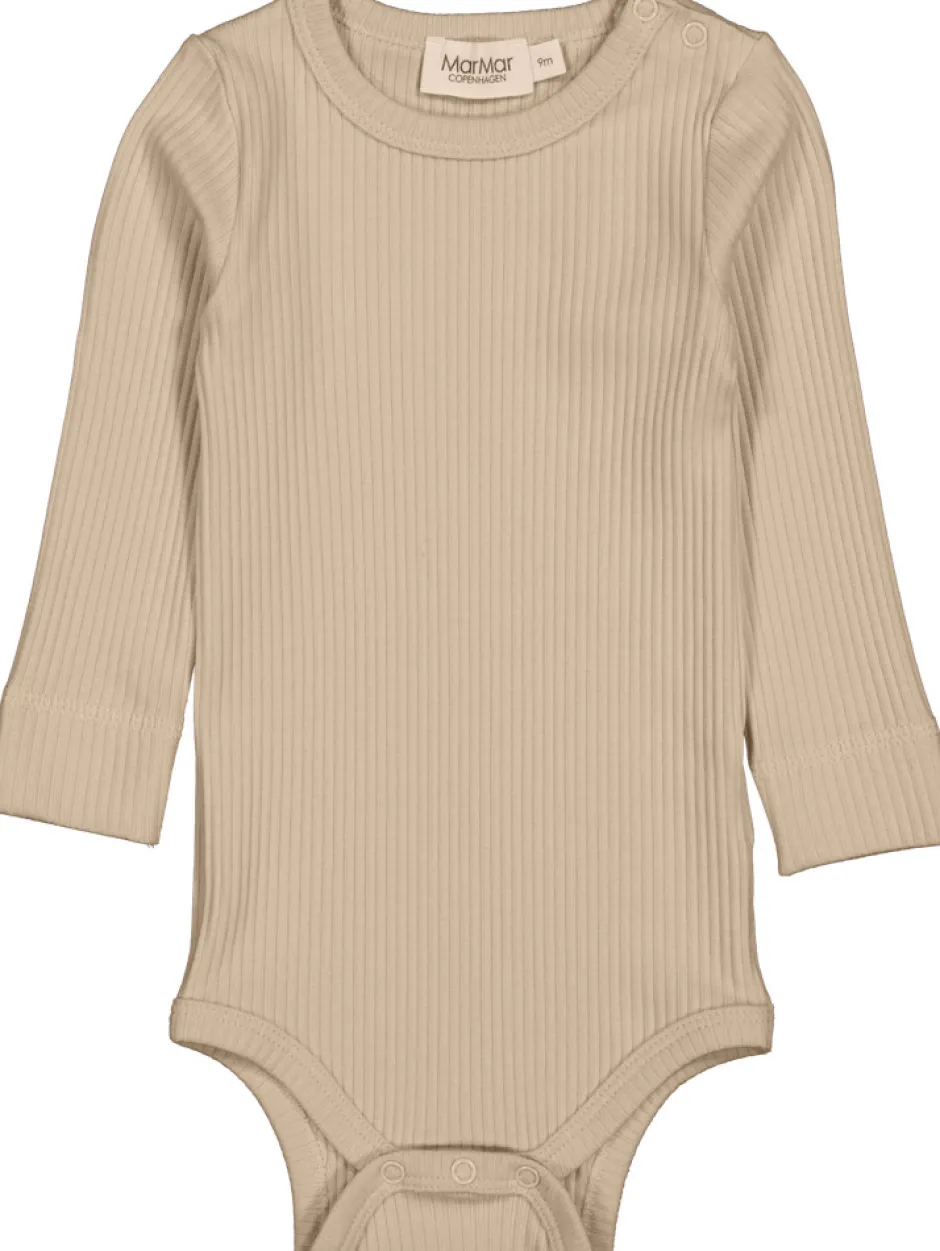 Enkel langærmet baby modal bodystocking, der bliver lukket mellem benene for nem bleskiftning. Bodystockingen er ribstrikket, blød, holder form og farve og har elastan i sig som gør den strækbar og behagelig at have på.