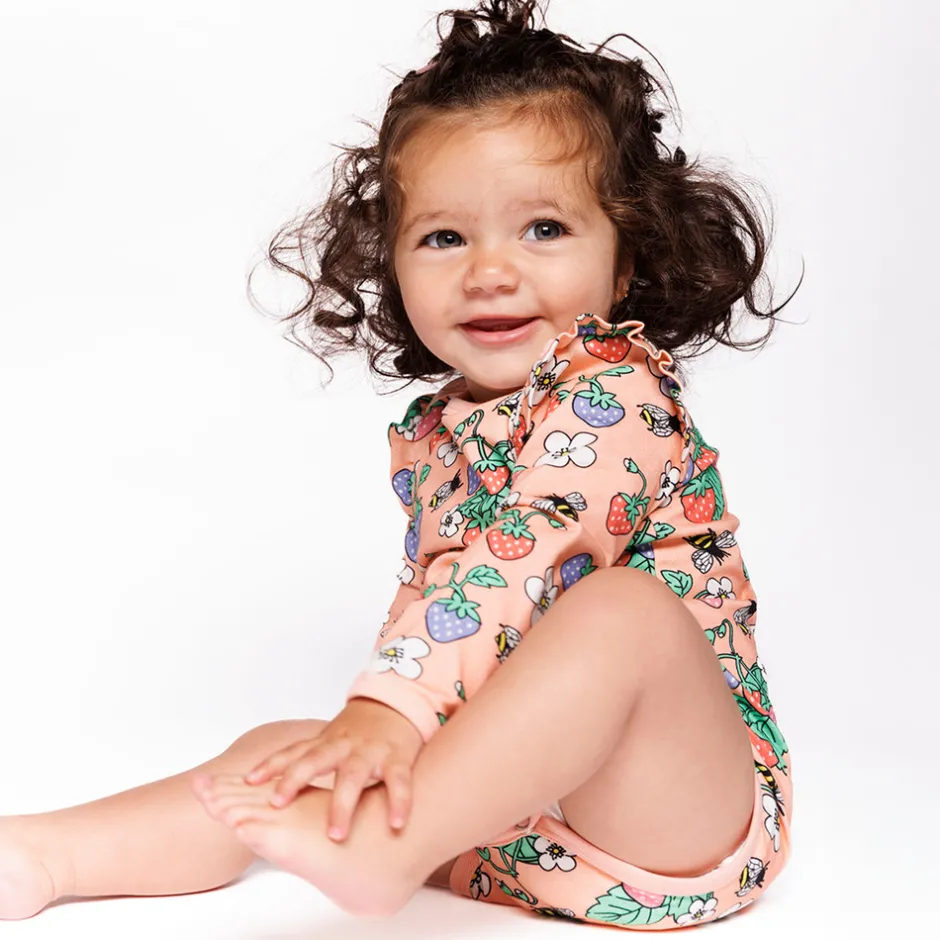 Langærmet baby body med jordbær produceret i en økologisk og strækbar bomuldsjersey. Denne body har en normal pasform med kuvertlukning og trykknapper, samt rib i halsen, på ærmerne og søde flæser på skuldrene.