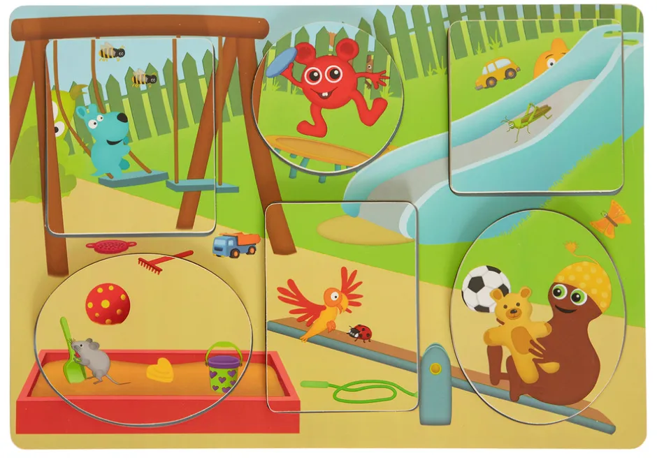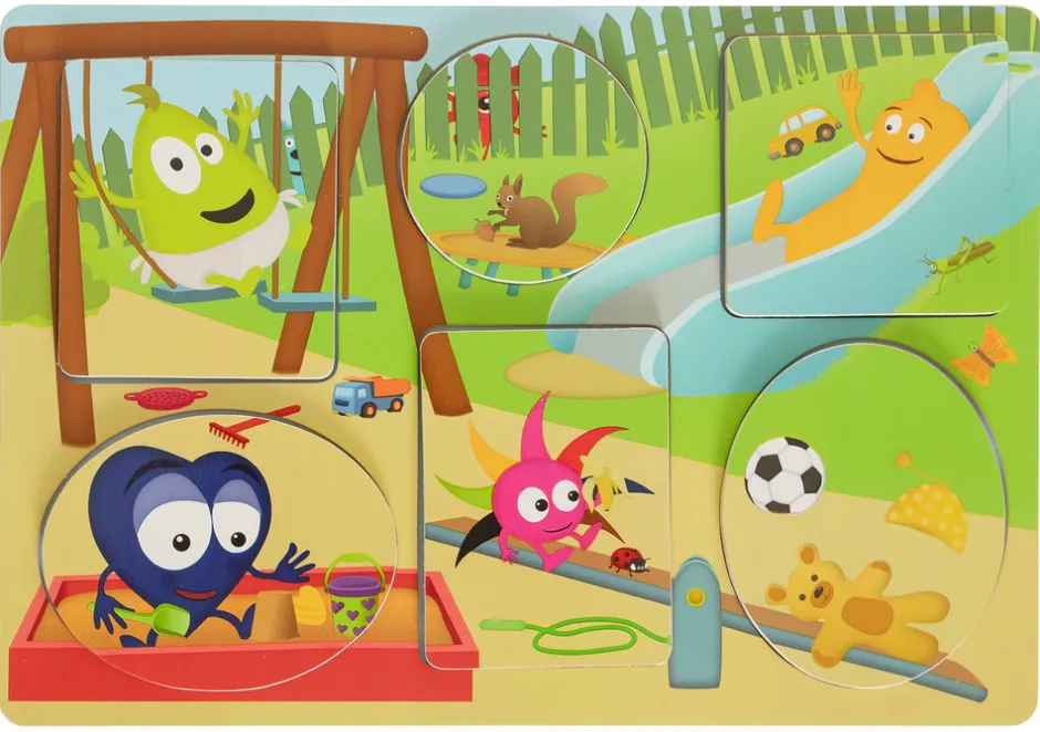 Dette sjove og farverige puslespil har et motiv af de seks Babblarna-figurer: Babba, Bibbi, Bobbo, Dadda, Diddi og Doddo, som leger på en legeplads og inviterer børn til at lege udenfor som en naturlig del af dagen. Pædagogikken bag puslespillet er, at figurerne gemmer sig forskellige steder, og barnet skal finde dem, samtidig med at det lærer at genkende firkanter og cirkler. Puslespillet består af 6 brikker med motiver på begge sider, hvilket giver mulighed for at bygge det på mange forskellige måder.