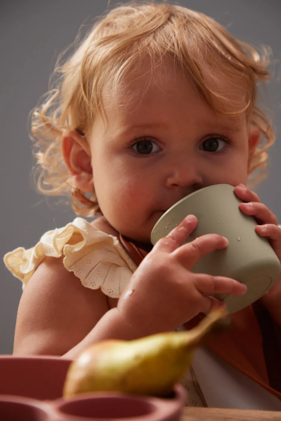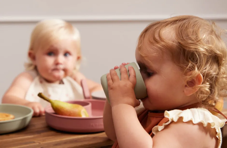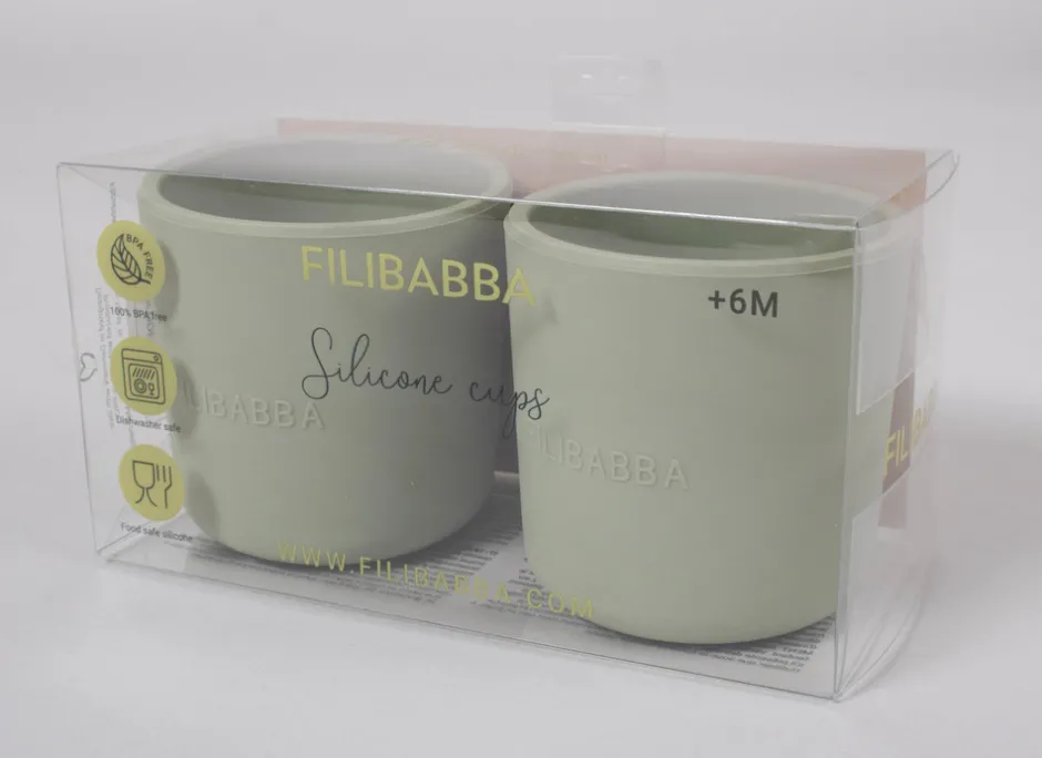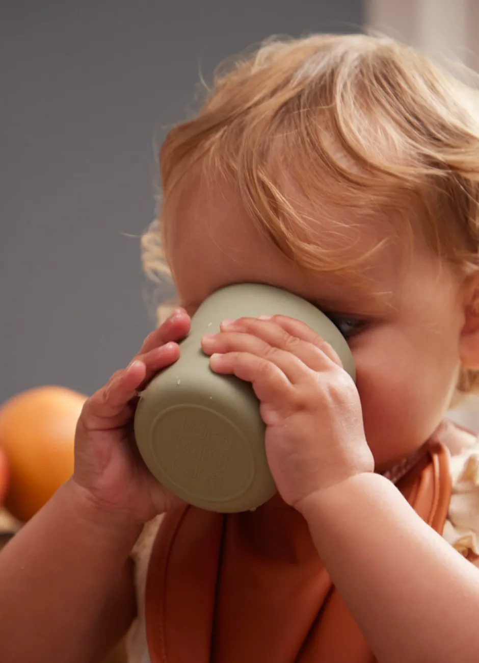 Fin mellemstørrelse kop der passer til mange størrelser børnehænder. Koppen er fremstillet i 100% silikone med en blød overflade, som både giver en behagelig følelse og et fast greb til børnehænder. Det er den ideelle kop til en børnefamilie, hvor det gerne må se fint ud, men samtidig skal være praktisk, derfor holder produktet også til fald på gulvet. Når det skal gå hurtigt, tåler produktet ovn, mikroovn og opvaskemaskine.