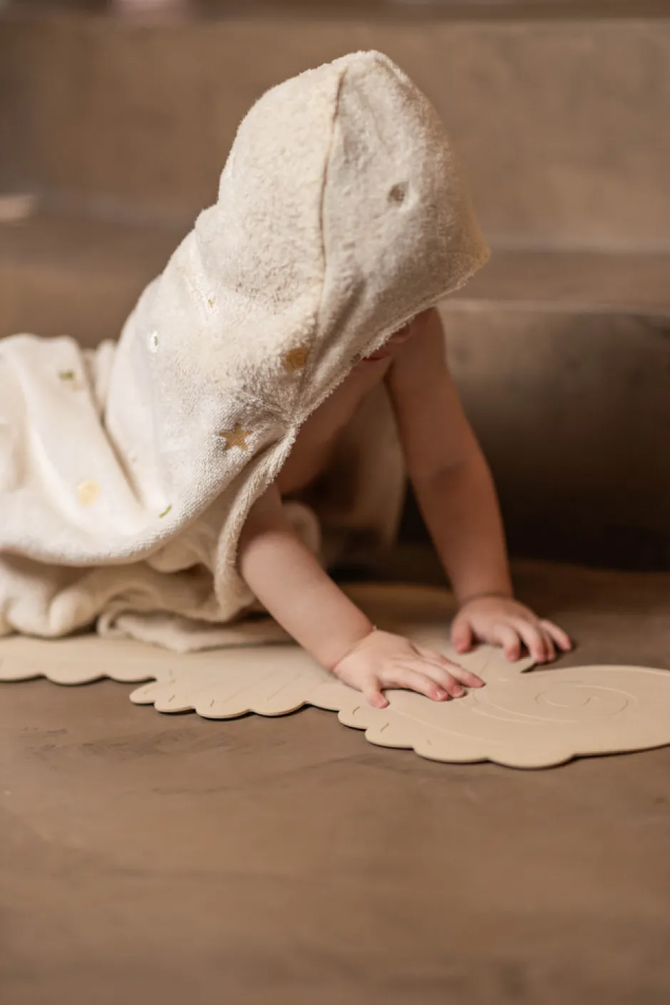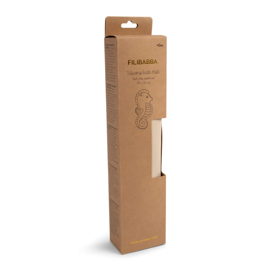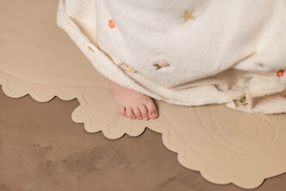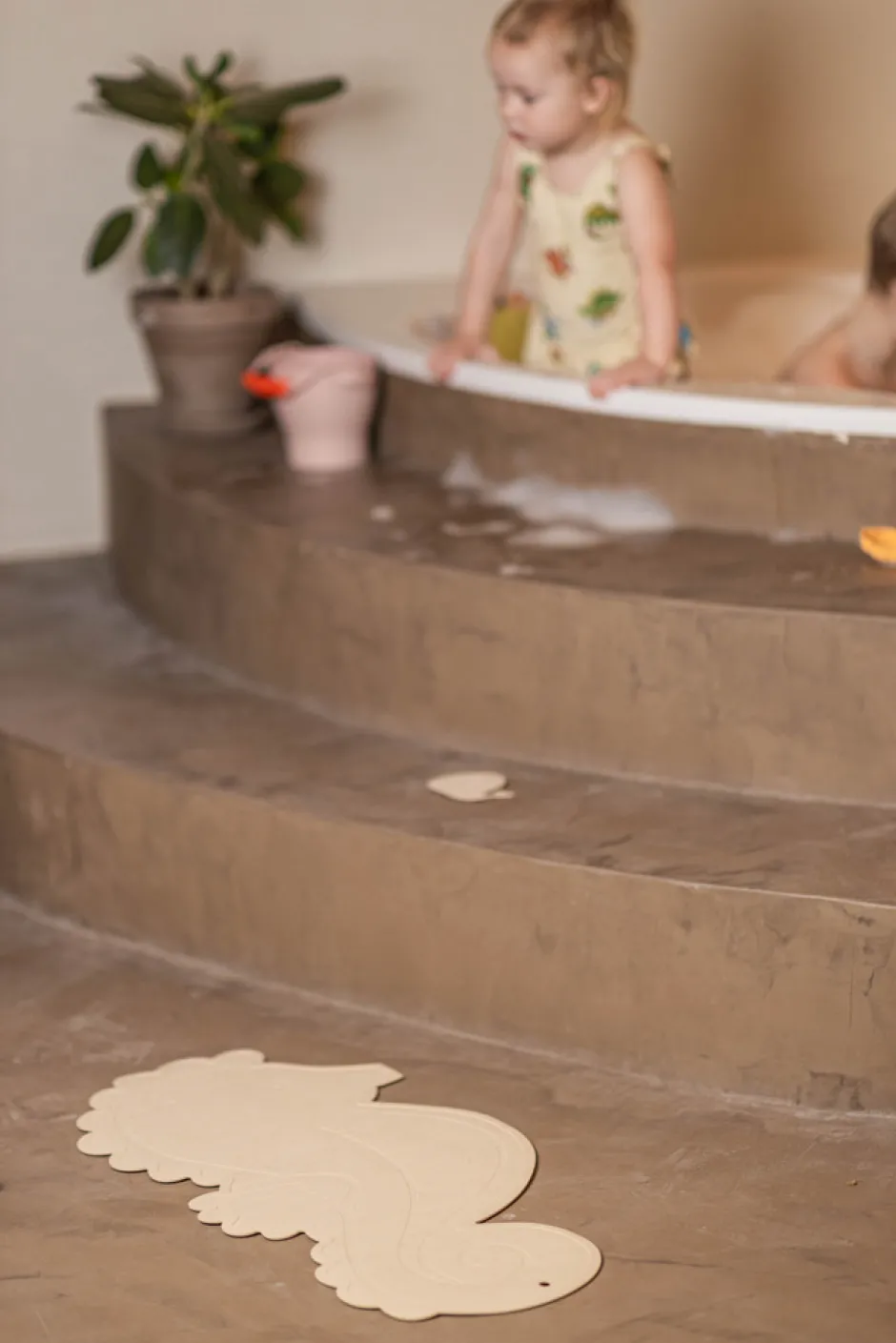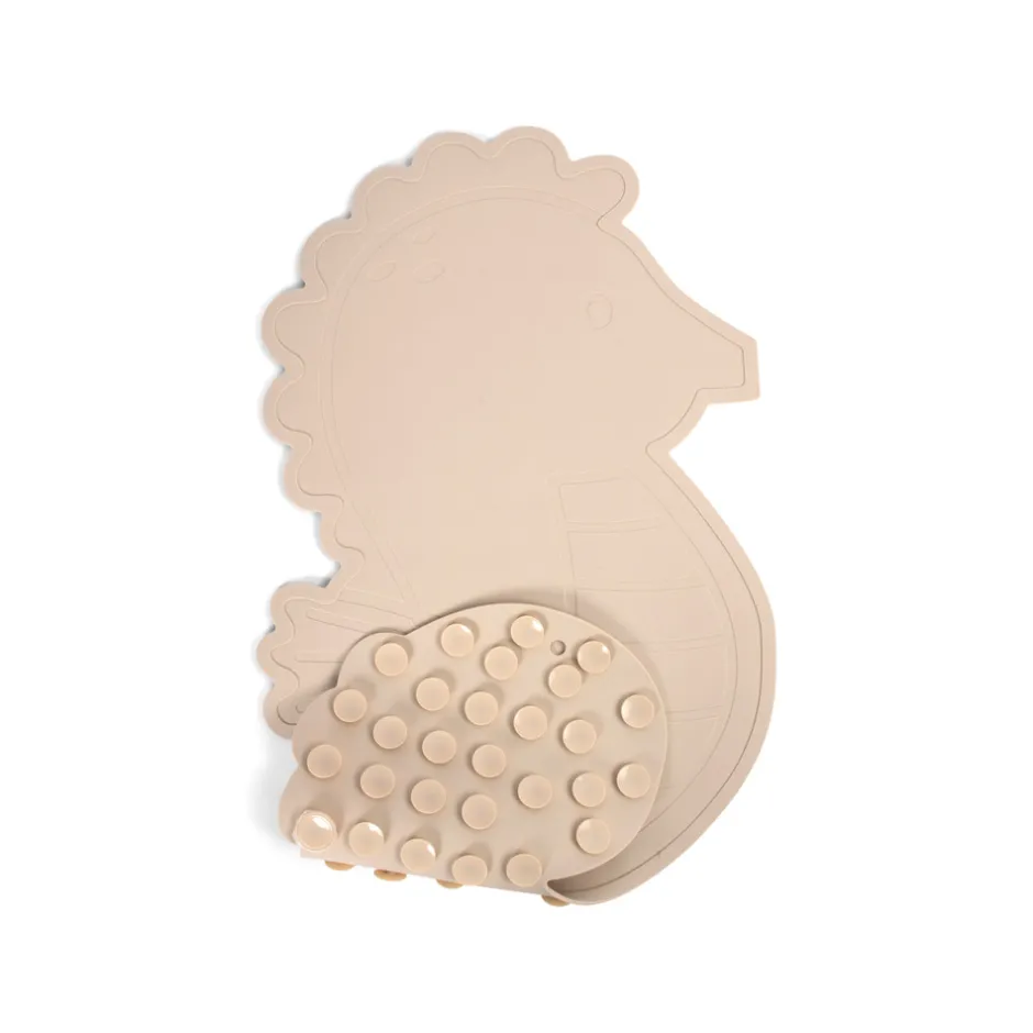Bademåtten er lavet af 100% silikone og har små sugekopper på bagsiden, som sikrer et stærkt greb på glatte overflader i brusenicher eller badekar. Den teksturerede overflade gør det lettere for dit barn at stå fast i badet.