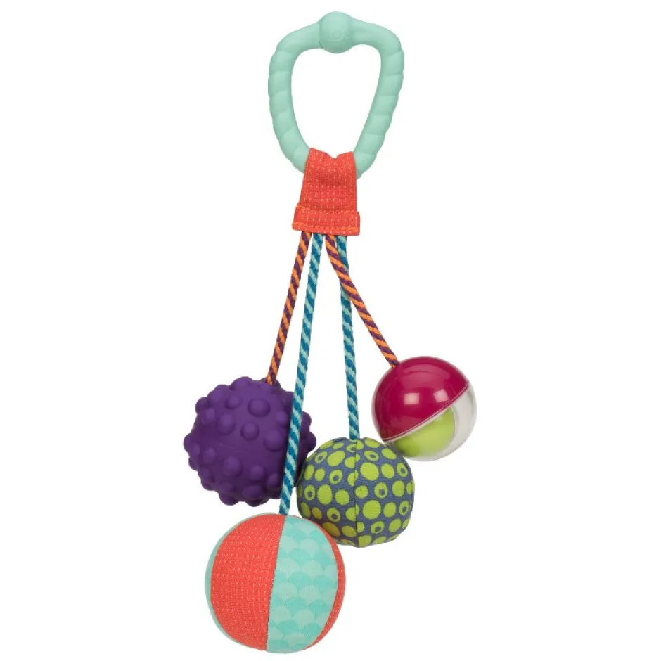 4 sjove bolde, som hænger i et ophæng, som også er en bidering. Boldene er i lækre farver, og forskellige teksturer og lyde. Nogle har rangle lyde, andre fine små lyde når man trykker på dem.