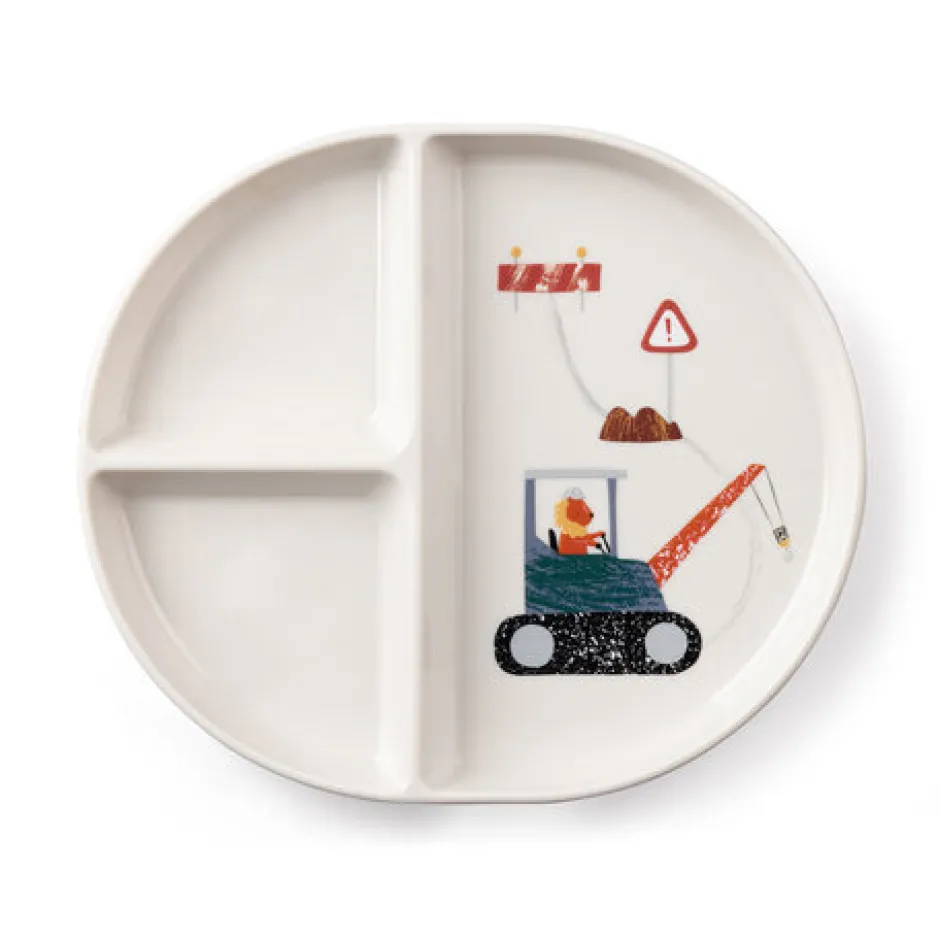 Flot ruminddelt tallerken med tre rum, sød babyskål og praktisk kop der har motiver fra Sebras tema Busy Builders – et byggeunivers fuld af sjov, aktivitet og begejstring over i fællesskab at få tingene til at ske og skabe noget stort. Dette er produceret i 100% Polypropylen (PP), Fødevare kontakt materiale