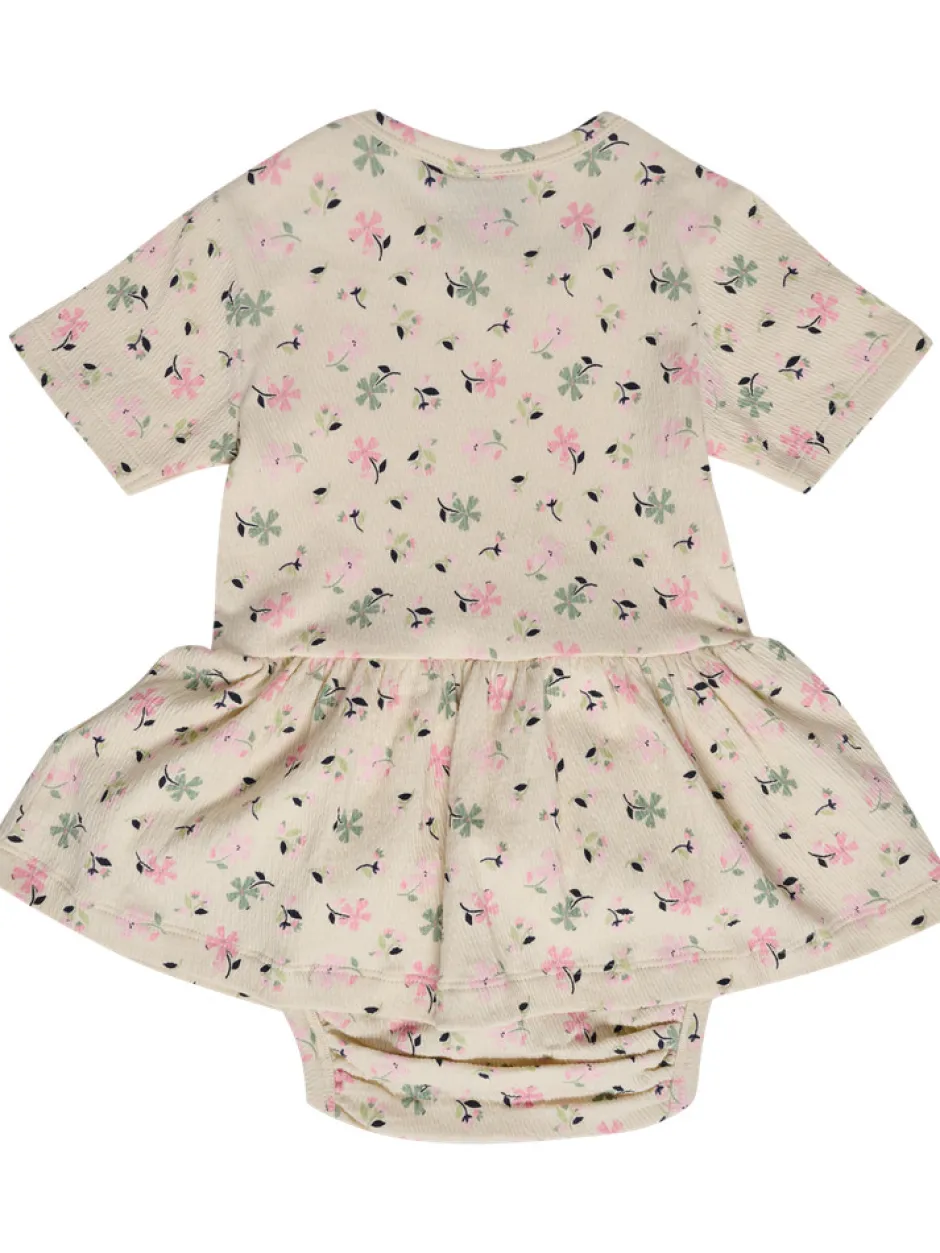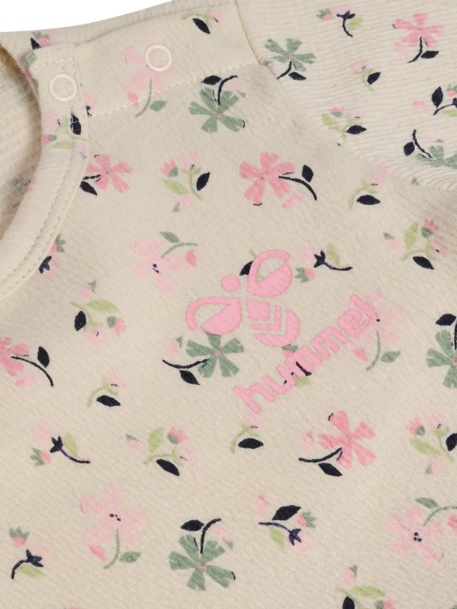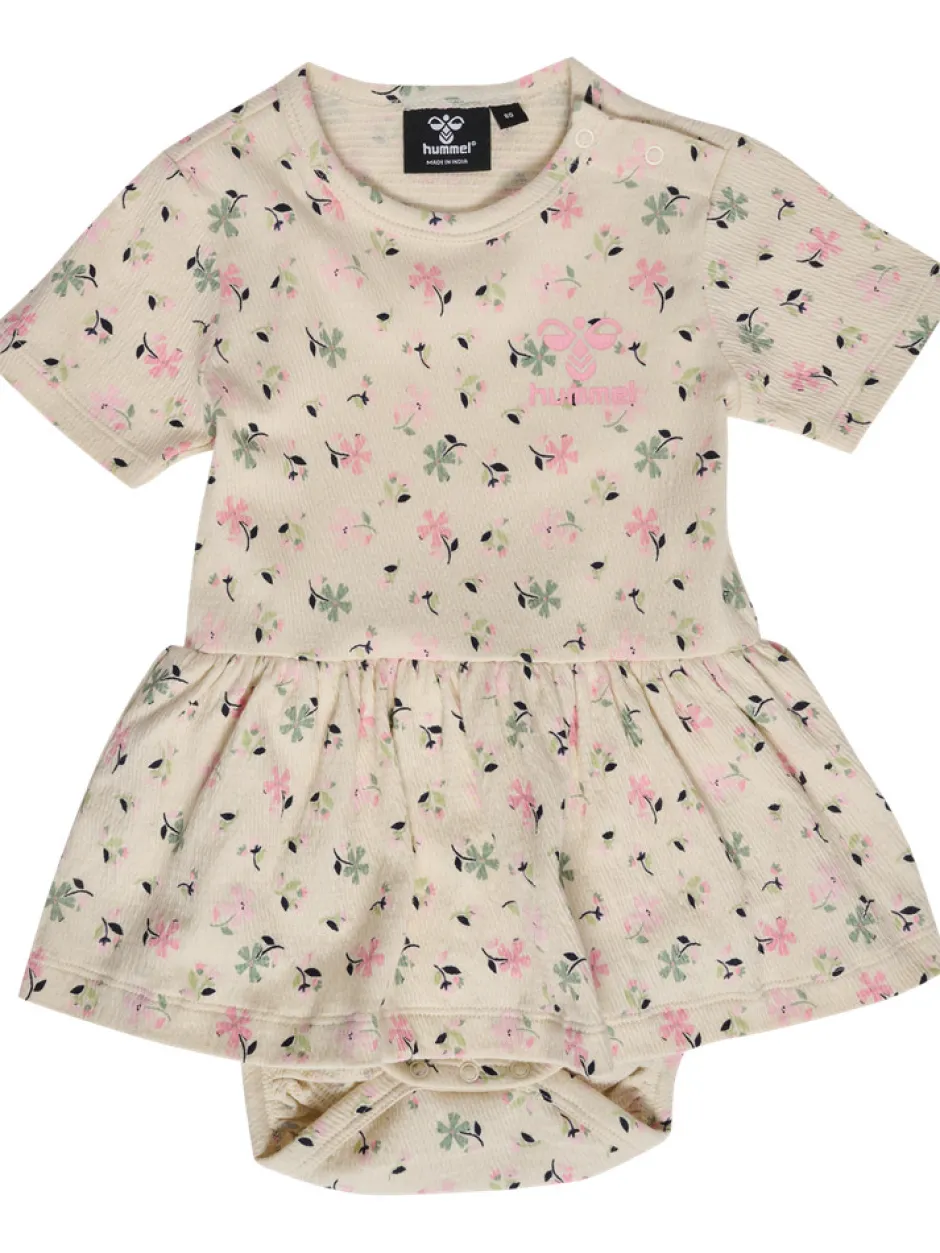 TYRA BODY DRESS S/S er lavet af blødt, strikket jerseystof og kombinerer den klassiske bodystocking-funktionalitet med et sødt kjolelook. Bodykjolen har et dekorativt all-over print og et trykt hummel bi-logo på brystet. Knapper i bunden og på skulderen gør det nemt at skifte dit barn i løbet af dagen.