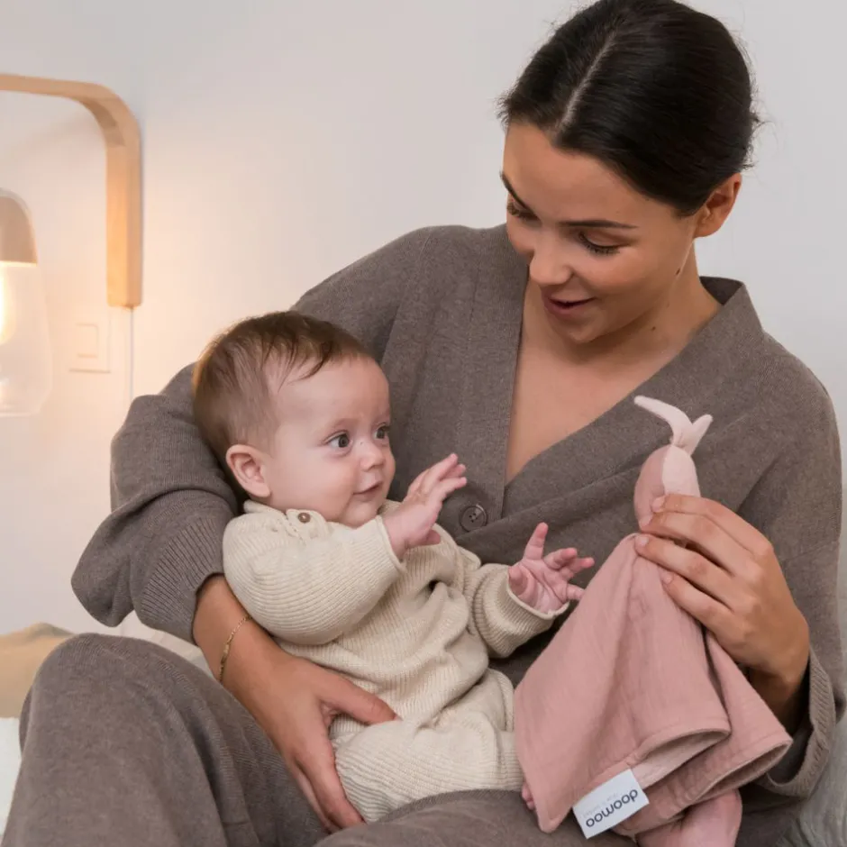 Doomoo nusseklud består af et vendbart lille dyr, hvor den ene side er en vågen kanin og den anden en sovende bjørn. Doomoo Blødt legetøj med to kæletæpper har en multifunktionel og smart funktion. Det giver tryghed gennem sansemotoriske egenskaber ved at bruge forældrenes duft i et af tæpperne.