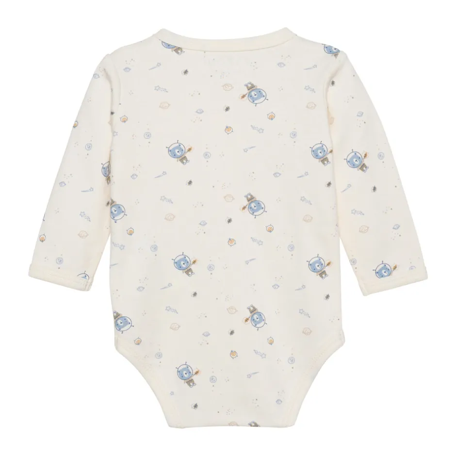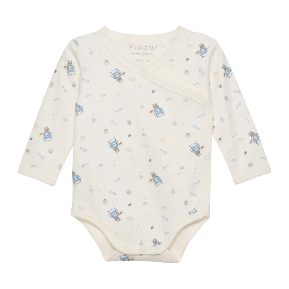 Bomuldsbody med trykknaplukning på skulderen og mellem benene samt ved slå-om-flappen i siden. Bodyen er lavet i ren, økologisk bomuld med all-over-print. Certificeret i hht. STANDARD 100 by OEKO-TEX® cert. nr. SH020 156011 TESTEX, tiltro til tekstiler