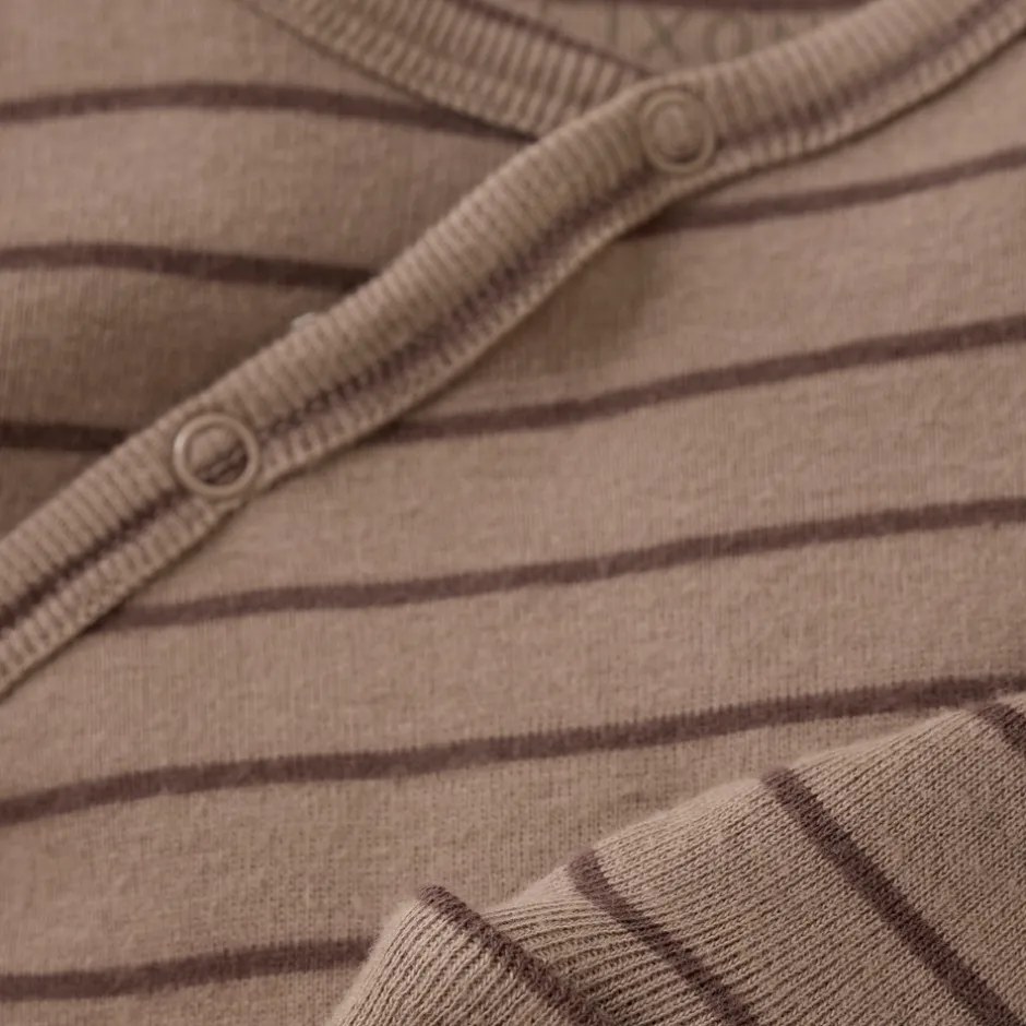 Stribet langærmet body fra FIXONI med smarte justeringsmuligheder.Bodyen lukkes med trykknapper foran og mellem benene. Den har justerbare trykknapper i skridtet, så længden kan tilpasses barnets vækst – og dermed forlænges brugstiden. Ærmerne har dobbelt lag, som kan foldes ind eller ud alt efter barnets størrelse.