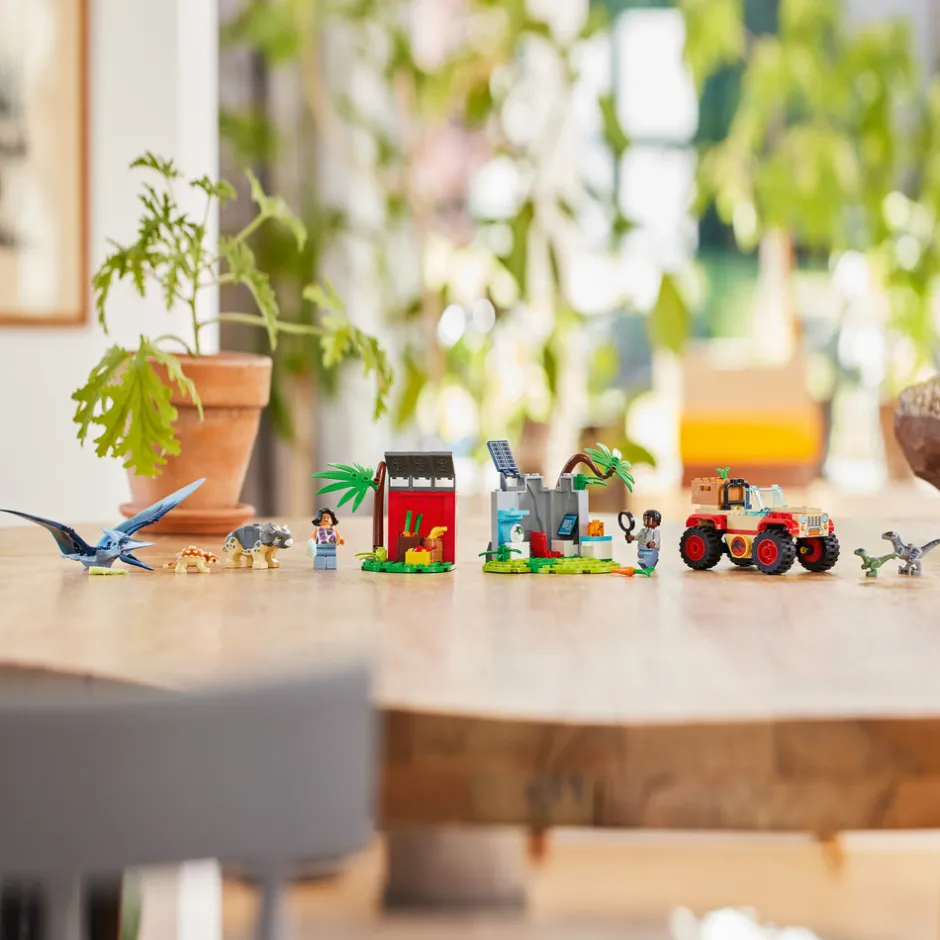 Hjælp Darius og Sammy med at fodre og pleje dinosaurerne på internatet 76963. Kør offroaderen hen til internatet, og læs kassen af. Sæt maden ved skuret, så de små dinosaurer kan finde den. Åh nej – den store pteranodon stjal fisken! Se ungerne spise og lege lidt. Se… Det er et nyt æg! Snart kommer der en ny dinosaurunge.