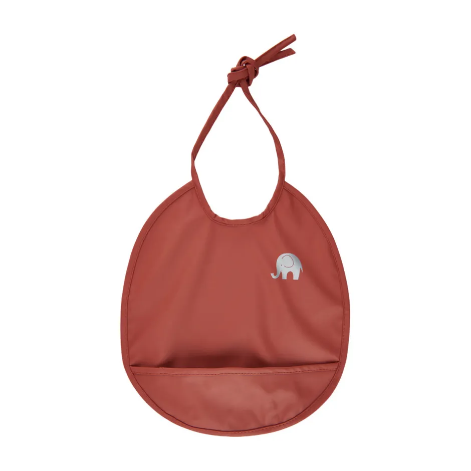 Rund, bred og praktisk hagesmæk fra CeLaVi. Åbnes og lukkes med bindebånd i nakken. Gummibelagt forside gør det nemt at tørre den af efter spisning. Materiale: 38% polyurethane – 62% polyester. Hagesmækken er uden flourstoffer.