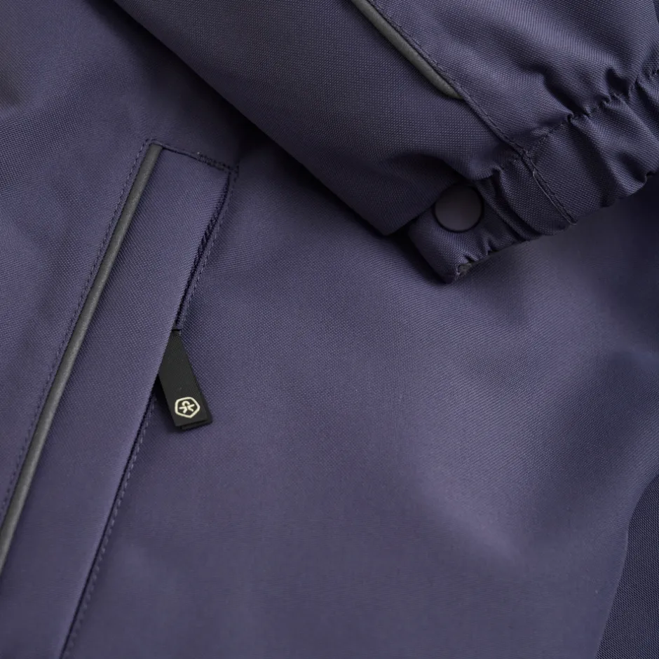 Flyverdragten lukkes med en robust kvalitets lynlås foran og ved de udvendige lommer. En blød hagebeskytter forhindrer irritation fra lynlåsen. Hætten er aftagelig, og den aftagelige pelskant giver fleksibilitet i udtrykket. De justerbare støvlestropper i silikone sikrer, at buksebenene bliver, hvor de skal – selv under leg.