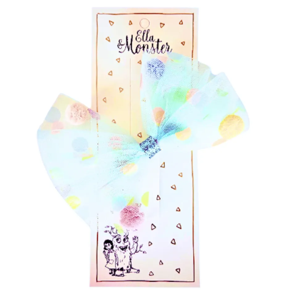 Feststemning med et enkelt klik! Denne store sløjfe i mint grøn tyl og farverige prikker er ren festglæde! Perfekt til børn der elsker farver, sjov og accessories der siger “nu fejrer vi!”. Let at sætte i – og garanteret midtpunkt til enhver festlig anledning.