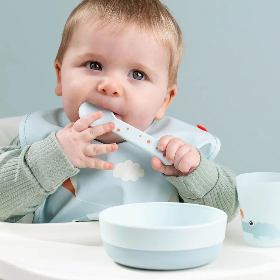 Denne praktiske hagesmæk med velcro i en dejlig blå farve er designet til at gøre måltider sjove for dig og dit lille barn. Med et legende motiv af Elphee og Croco, der nyder legepladsen, tilføjer denne hagesmæk et strejf af leg til hvert måltid.
