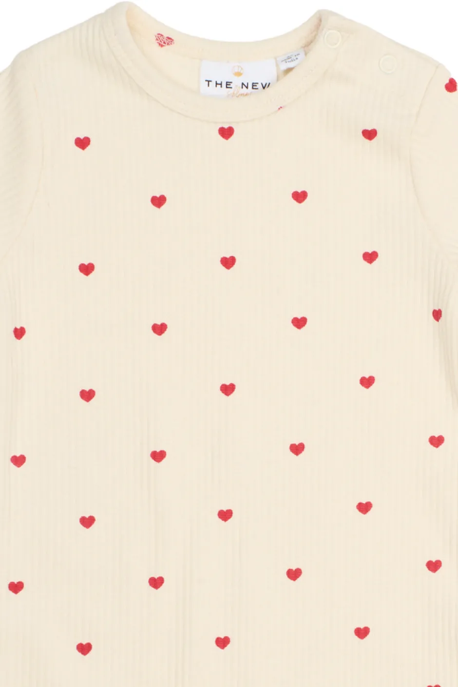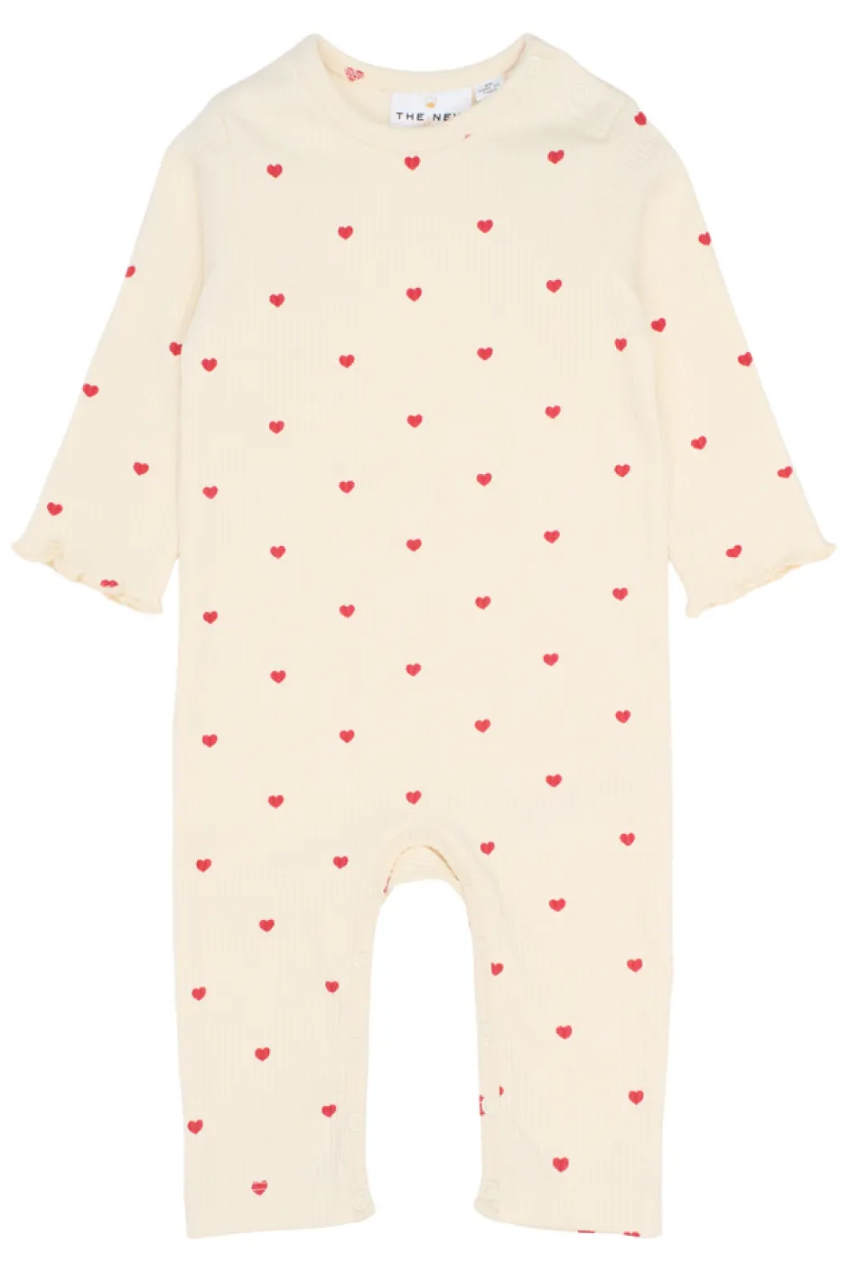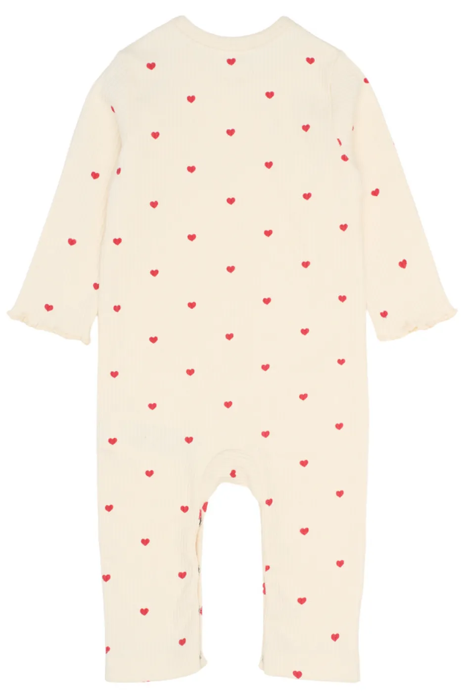 Denna heldress från THE NEW Siblings är både bedårande och praktisk – perfekt för vardagens små äventyr. Den har ett charmigt all-over print av små hjärtan som ger en söt och lekfull touch. Kostymen har långa ärmar och ben, tillsammans med praktiska tryckknappar vid axeln och längs benen, vilket gör den enkel att ta av och på.