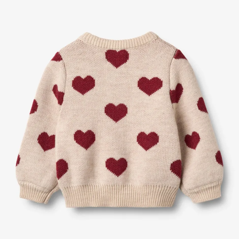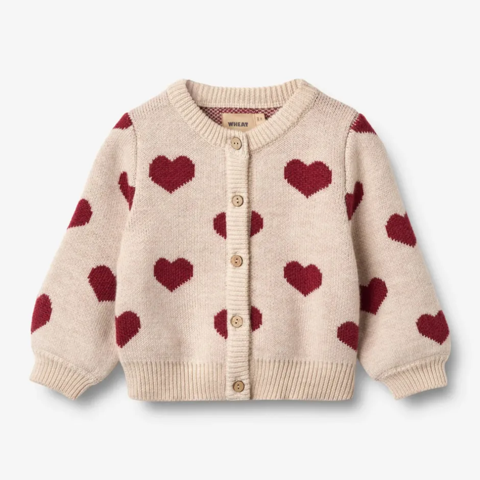 Langærmet strikcardigan i blødt merinould til din baby. Wheats strik er et must, når vinterkulden nærmer sig. Denne cardigan oser af julens nærvær med sit fine print med hjerter. Perfekt til både en body, leggings og kjoler, uanset om det er til en julefest eller hygge hjemme i weekenden. Brug den som et ekstra lag under jakken, så dit barn kan være lunt pakket ind hele sæsonen.