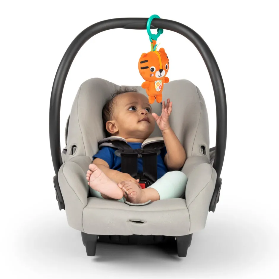 Små tigre elsker Bright Starts’ rangle-legetøjet, der inviterer dem til at rasle, røre og lege. De klare farver og lyde vil opmuntre dit barn til at række ud efter sin nye tigerven, og du vil nyde at se dit barn lære nye færdigheder. Babyer elsker tigerens farverige mønstre, de forskellige materialer, de bløde tekstiler og det skjulte klokkespil, der siger sjove lyde, hver gang de ryster tigeren. Forældrene er derimod glade for denne venlige tigers alsidighed. Legetøjet kan nemlig nemt fastgøres til barnevognen, pusletasken og aktivitetsstativet, så din baby aldrig behøver at undvære sit yndlingslegetøj. Alt dette gør denne fine tigerven til familiens favorit!