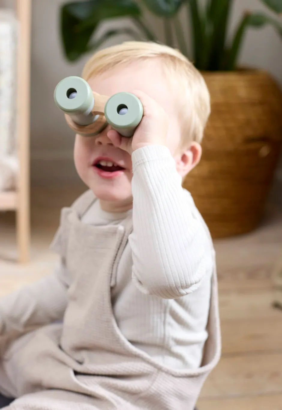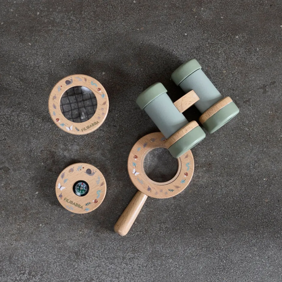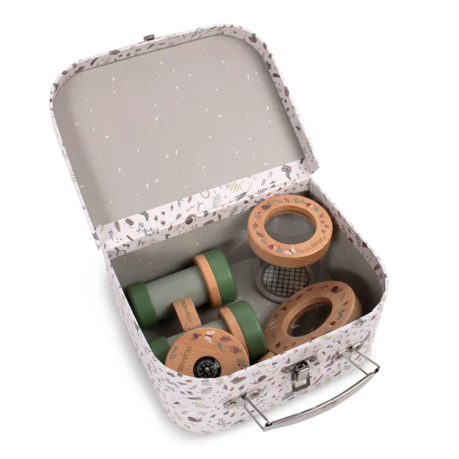 I kufferten finder du en kikkert, et insektglas med lup, et kompas og et forstørrelsesglas, som du kan gå på opdagelse med. Hvert legetøj i sættet har detaljer af træ, der gør legen ekstra sjovt.