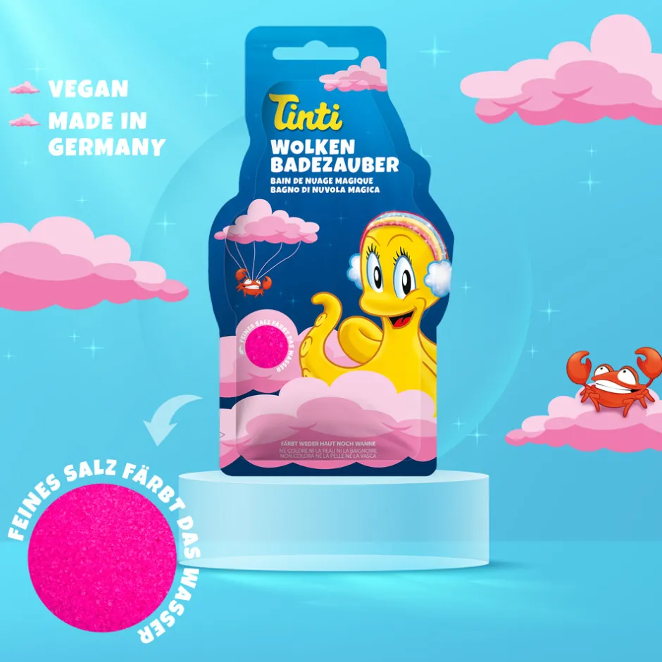 Var det noget med lyserøde, bløde skumskyer i vandoverfladen og et badevand, der dufter af søde bær? Så har du fundet det helt rigtige produkt. Spred de lyserøde saltkrystaller i vandet og se hvordan der bliver fremtryllet et fint badeskum i vandoverfladen, mens vandet samtidig bliver farvet lyserødt og dufter frisk. Posen har et fint vindue, så barnet kan se saltkrystallerne før de kommer i brug.