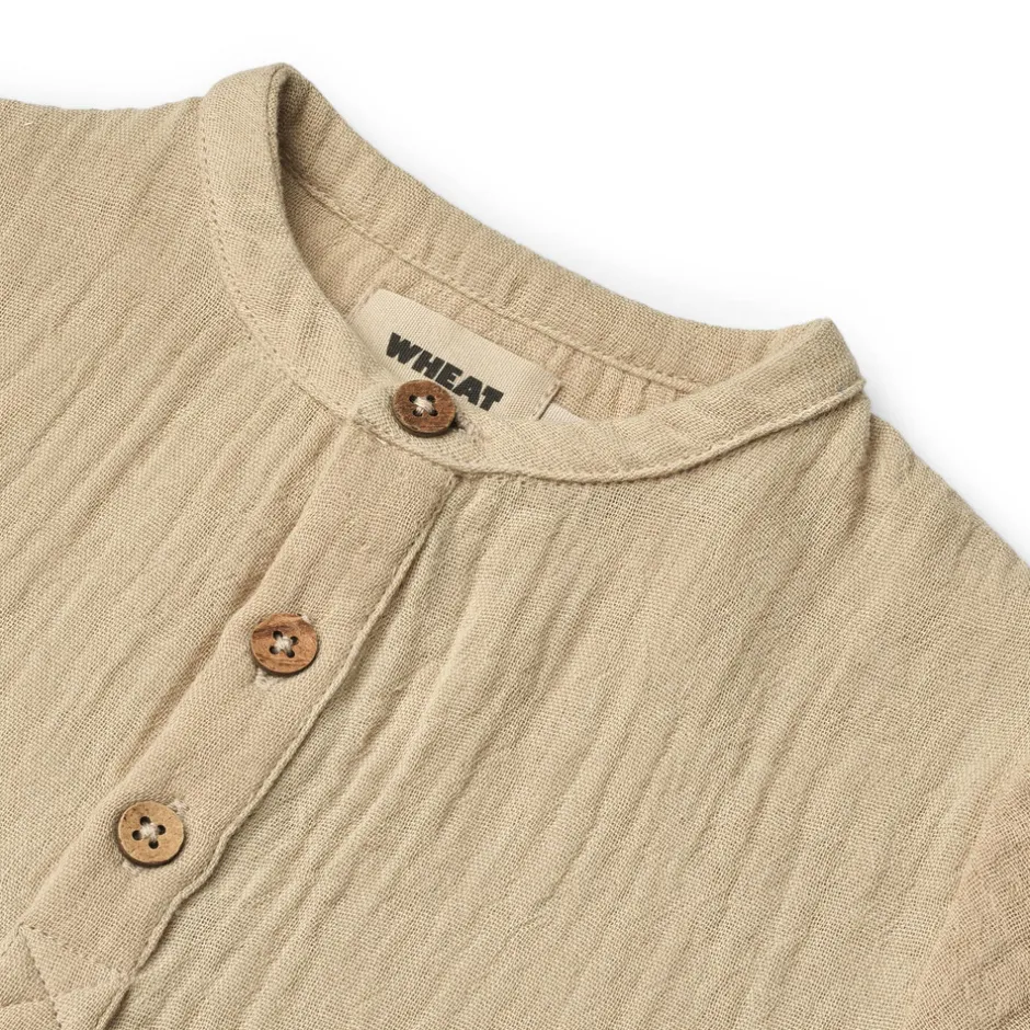 Wheat’s skjorter er unisex og perfekte til mange specielle lejligheder og hyggelige dage i foråret og sommeren. Skjorten er behagelig at have på med en afslappet pasform og knapper halvvejs ned foran. Skjorten giver outfittet et mere klassisk udtryk, og du kan let style den med et par bukser og en strik for at fuldende looket. Du kan også rulle ærmerne op for et mere afslappet hverdagslook.