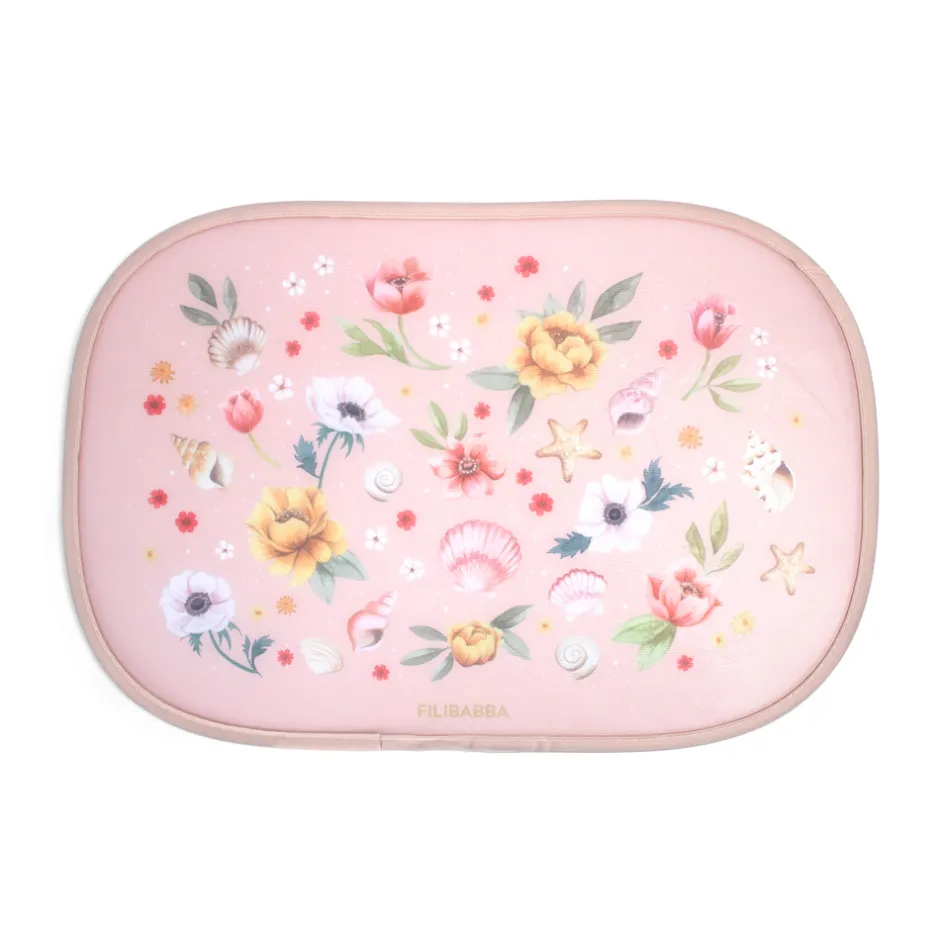“Ocean Blossom”-printet fanger de skatte, som børn elsker at samle og tage med hjem. Hvert blomsterblad og hver lille detalje er håndtegnet med bløde penselstrøg i akvarel, hvilket forvandler hvert blik til en fortryllende opdagelsesrejse.