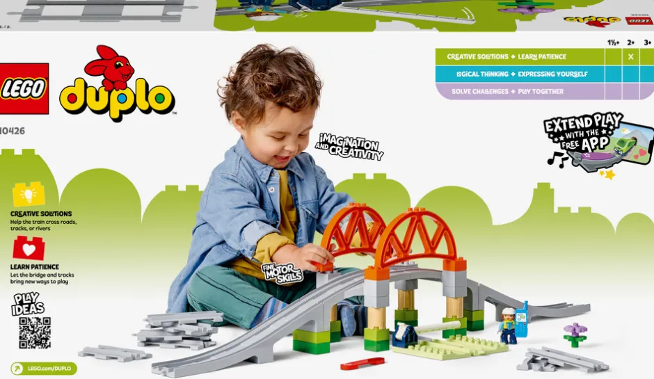 Løft et lille barns jernbaneleg til næste niveau med udvidelsessættet Togbro og spor (10426). Med dette kreative bygge- og ombygningslegetøj kan de mindste føje en forhøjet bro til deres interaktive LEGO® DUPLO® By-togsæt (10427 og 10428, sælges separat) og forlænge ruten med 8 lige togskinner, der kan kombineres med ethvert LEGO DUPLO togsæt. Sættet omfatter også en bro, der kan bygges, og en barriere, der kan hæves. Børn fra 2 år vil få masser af sjov med at lege, at de er ingeniøren, der slipper toget igennem, mens de samtidig træner deres finmotorik. Sættets funktionsklods får de interaktive tog fra sæt 10427 og 10428 til at stoppe op og afspille sjove lyde, når de kører over den. Læringslegetøjet giver tumlingers udvikling et boost.Ved at forlænge togsporet, så det kører over broen, styrkes deres rumlige opfattelse. Ved at samle legetøjsbanen og bestemme togets destination fremmes forudsigelses- og problemløsningsevner, og små børn udvikler tålmodighed og fokus.
