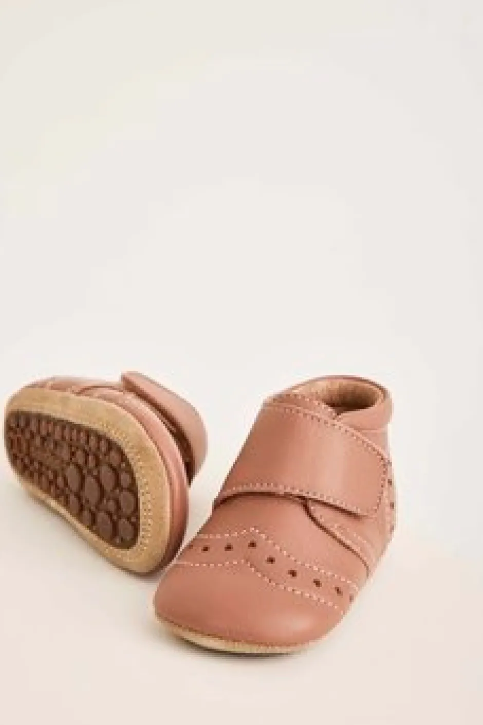 Hjemmesko, som også kan bruges som prewalker med velcrolukning, skindfoer og en blød sål af ruskind og skridsikker gummi, der giver den optimale støtte. Hjemmeskoen er produceret i 100% naturligt og åndbart læder, der er lukket rundt om foden og samtidig giver foden plads til at vokse.