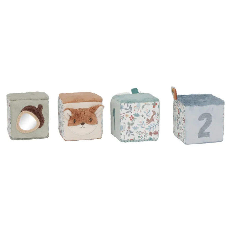 Med forskellige lyde, teksturer og farver at udforske vil dette sjove og søde sæt af bløde aktivitetsterninger fra Forest Friends kollektionen holde din lille underholdt i timevis, samtidigt med at det fremmer hånd-øje-koordination på en legende måde. Sættet består af 4 plysterninger i smukke farver og tallene fra 1 til 4. Terningerne er lette at gribe om for små hænder og der er masser af sjove mærkater, teksturer og et spejl at udforske.