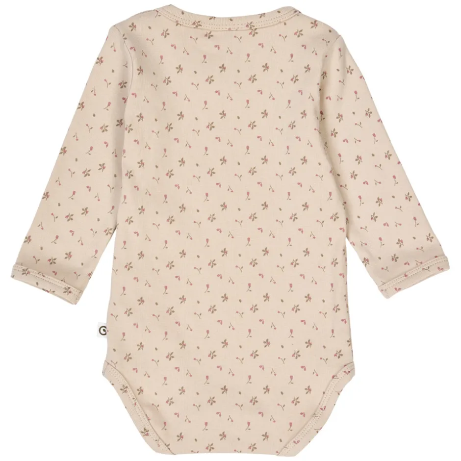 Denne fine body er dekoreret med et smukt, gennemgående blomsterprint, der giver et sødt og naturligt udtryk. Den lukkes nemt med trykknapper i både halsåbningen og forneden, hvilket gør den praktisk i hverdagen.