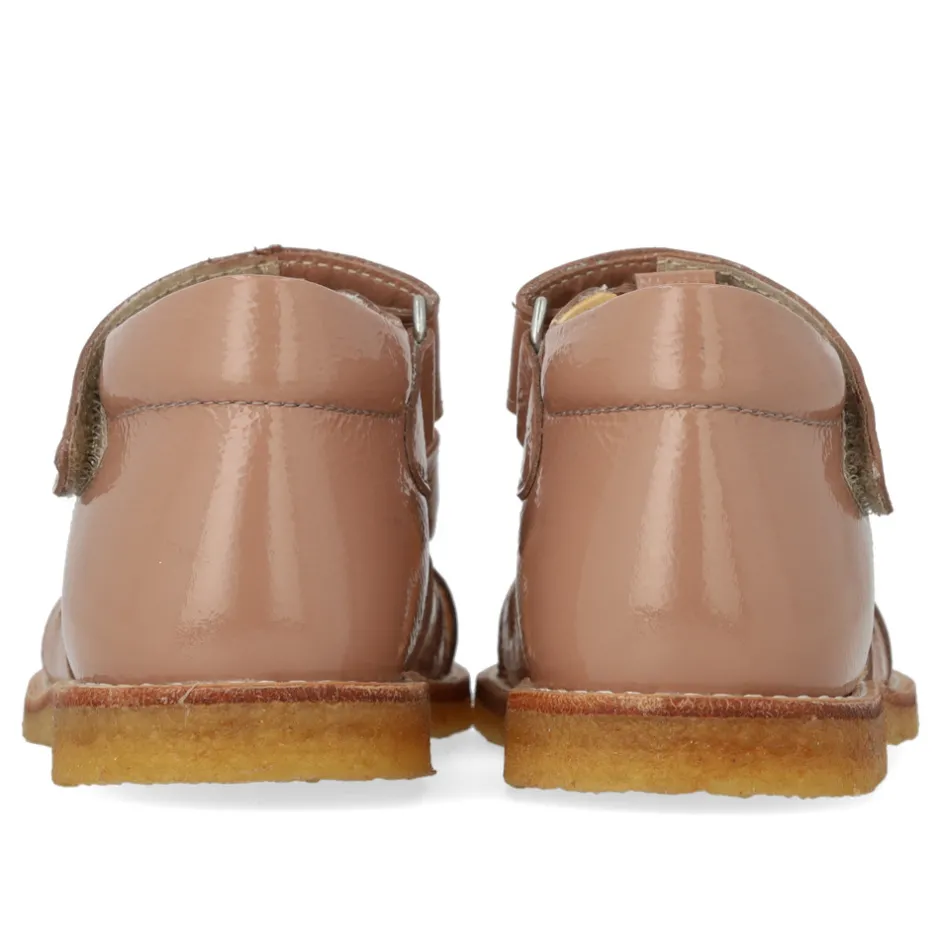 Begyndersandal med sløjfe og justerbar velcro. Lukket tå og fast hælkappe for maksimal støtte.